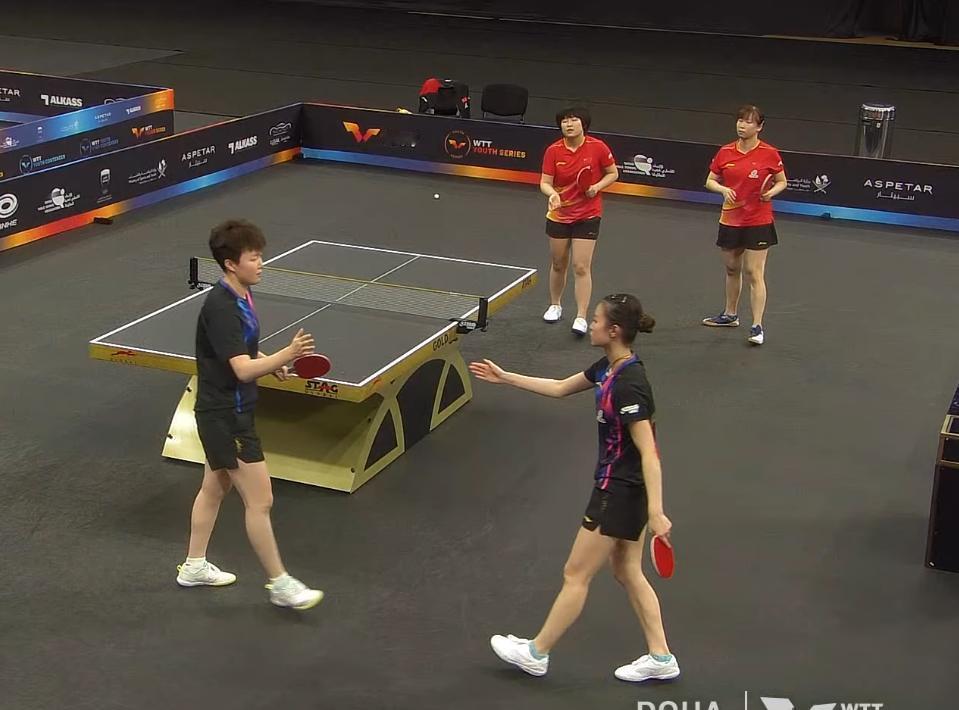 喜讯!国乒首个冠军出炉! 覃予萱/纵歌曼3:0击败韩菲儿/范姝涵, 获得多哈支线赛女双冠军! 第一局覃予萱/纵歌曼6:1开局, 11:4 拿下。 第二局覃予萱/纵歌曼4:1开局, 11:6拿下 第三局覃予萱/纵歌曼4:1开局, 11:5拿下