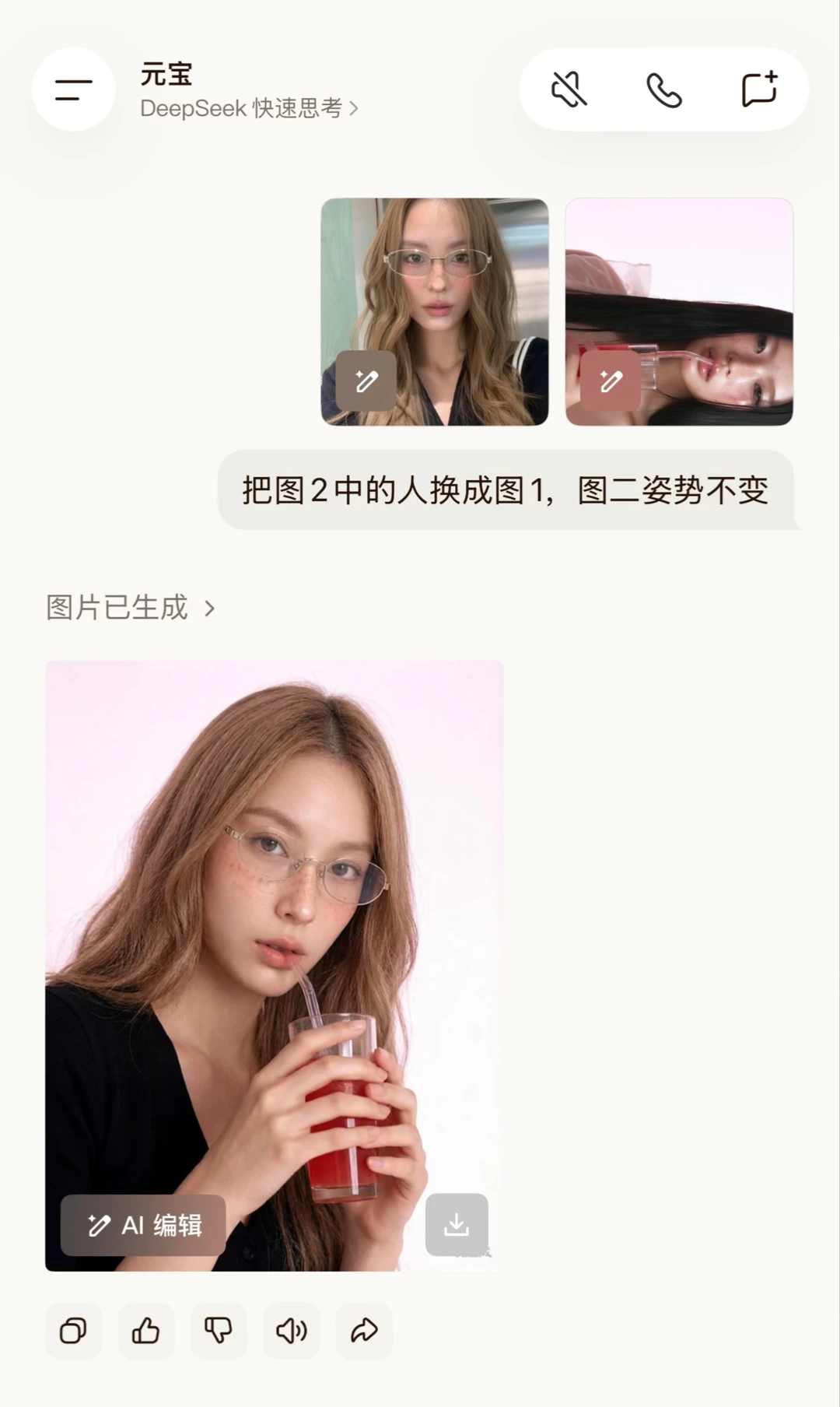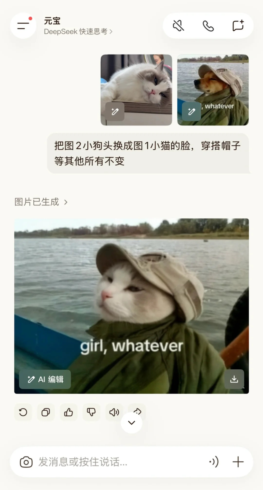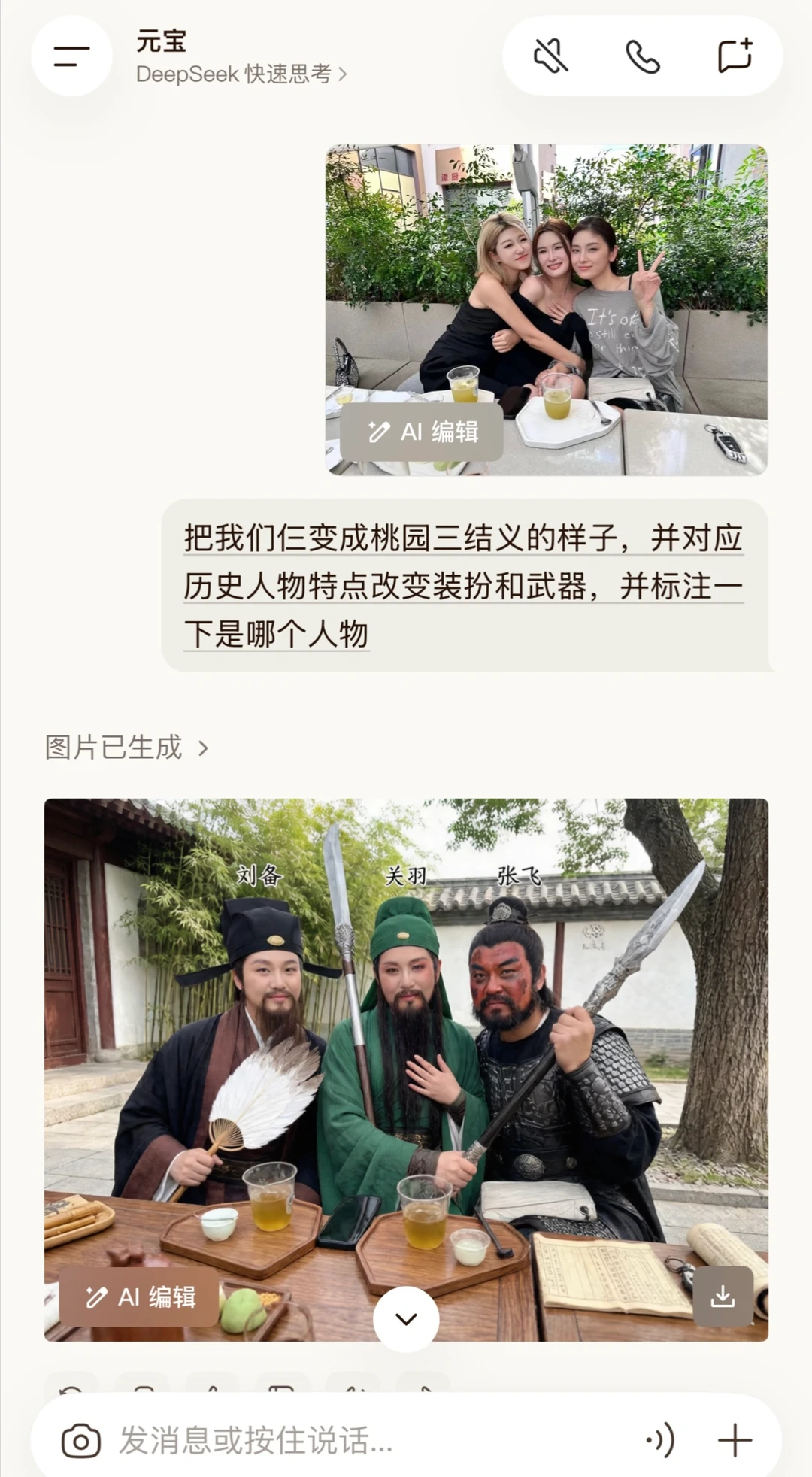 哈哈哈哈元宝p图你太能整了 我的小狗变成人还是蛮帅的! 但我怎么那么邋遢hhhhh 过年和姐妹合照后 立马给她们P一个桃园三结义 谁是大哥谁请客🤪 而且我也拥有了我的小猫梗图哈哈哈 这个功能太好玩了😙 元宝生成的图片真的好真实好清楚诶 还用自己照片臭美 做了两张杂志感大片 立马更新朋友圈!!!