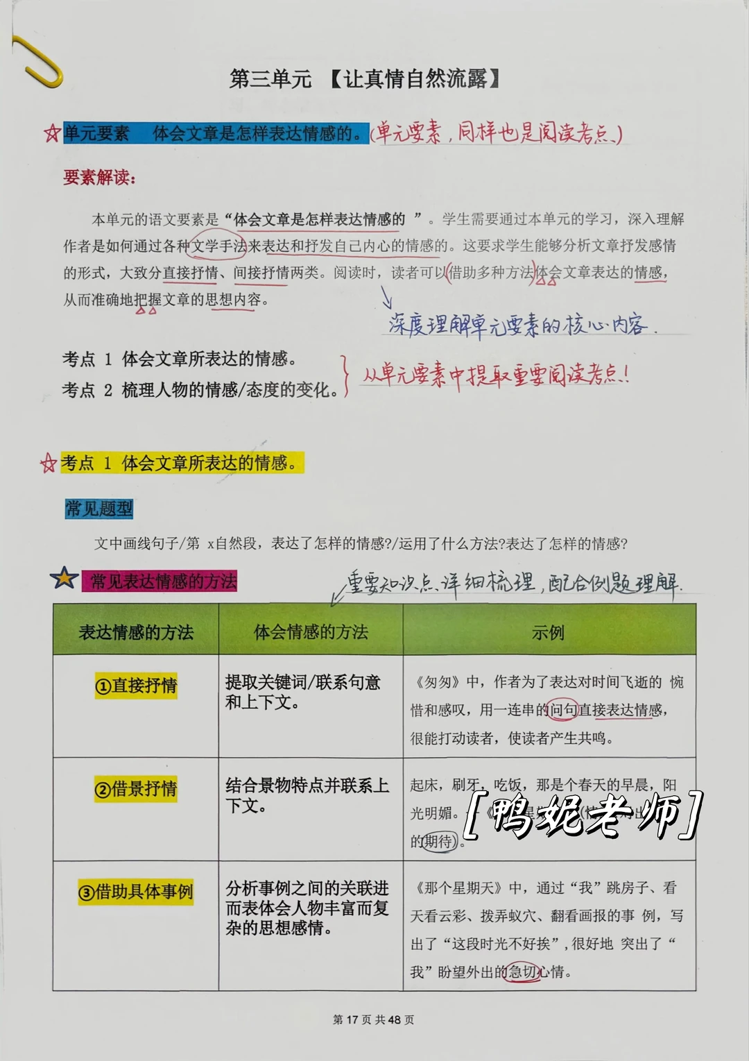 🔸第三单元的语文要素: 体会作者是怎样表达感情的。 ▫️本单元聚焦于情感表达的真实性与艺术性 👉引导学生理解情感不仅可以通过直接抒发,更能借助景物、事件、细节等间接方式自然流露,并最终在习作中学会“让真情自然流露”,形成从“感悟情感”到“表达情感”的完整能力路径。 在阅读训练中,重点在于理解并掌握多种体会表达作者情感的方法:①直接抒情;②借景抒情;③借助具体事例抒情;④借助人物描写方法抒情。