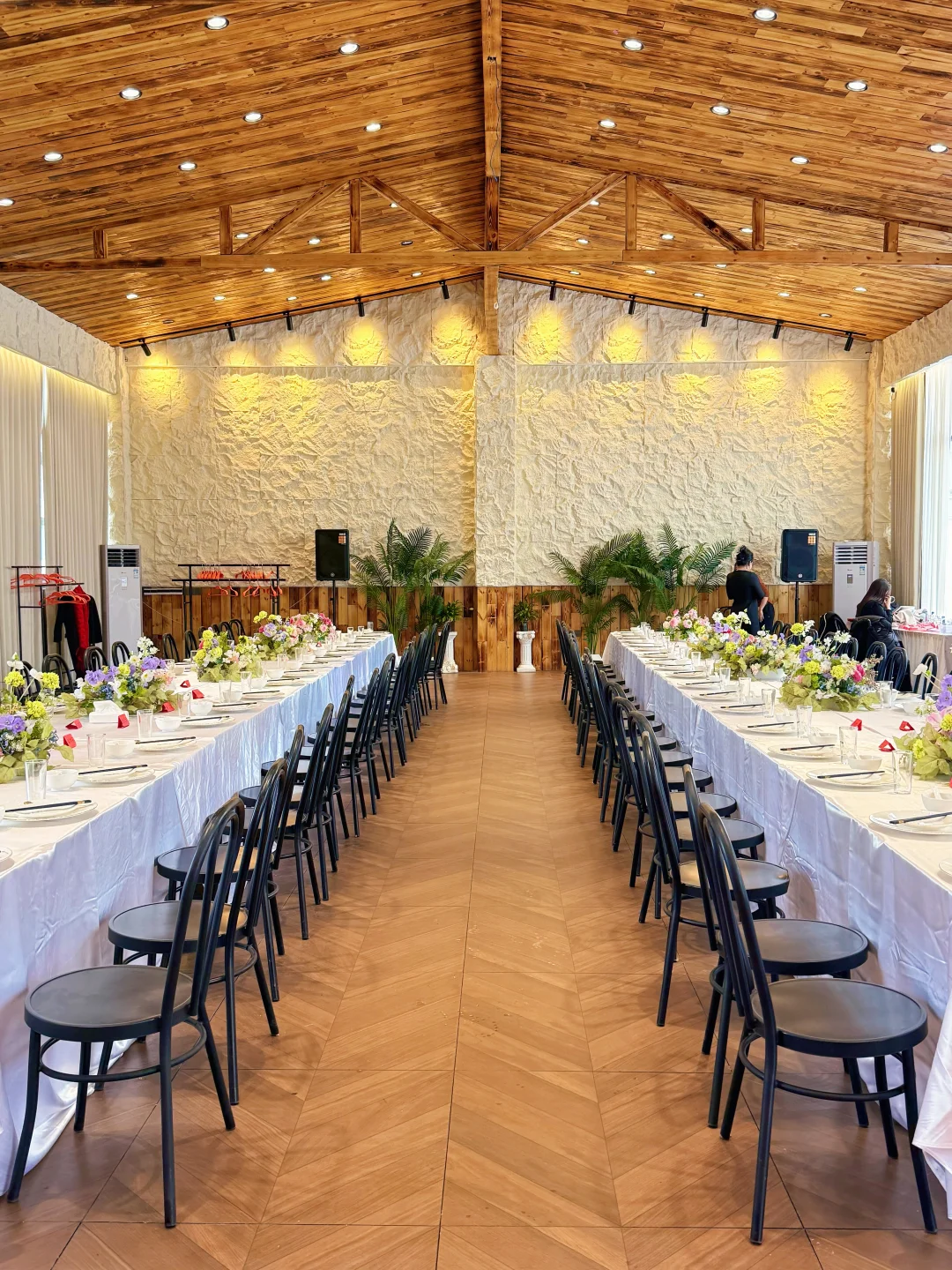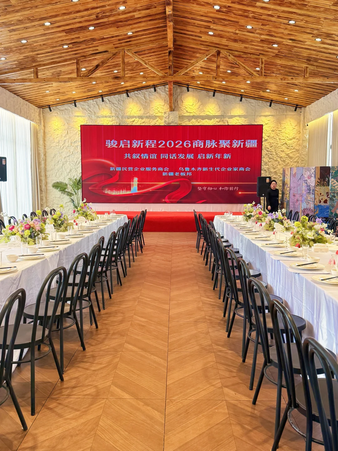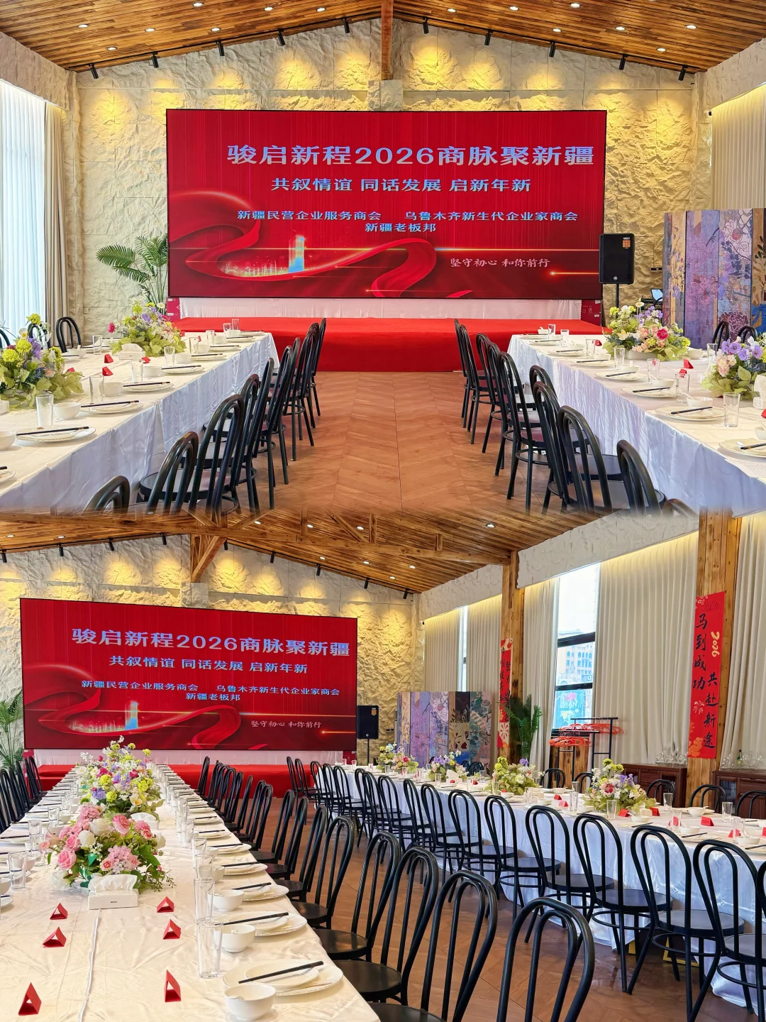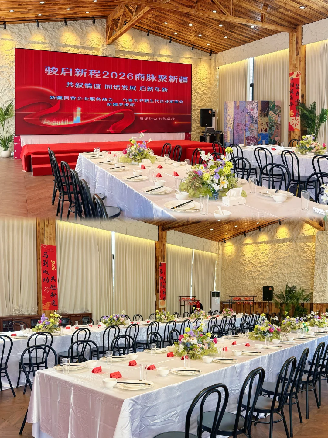 在乌鲁木齐挖到一个超适合商会、企业年会、商务宴请的宝藏场地! 🌿 环境亮点 ✅ 挑高木质穹顶 + 天然石墙,大气又有质感 ✅ 无柱开阔空间,能轻松容纳百人商务晚宴 ✅ 高清LED大屏+专业音响,演讲、颁奖、表演都能hold住 ✅ 轻奢花艺布置,细节里拉满高级感 💡 适配场景 ✔️ 商会年会/行业峰会 ✔️ 企业客户答谢宴 ✔️ 商务私董会/团建聚餐 ✔️ 新品发布/签约仪式 📍坐标:胜天如院