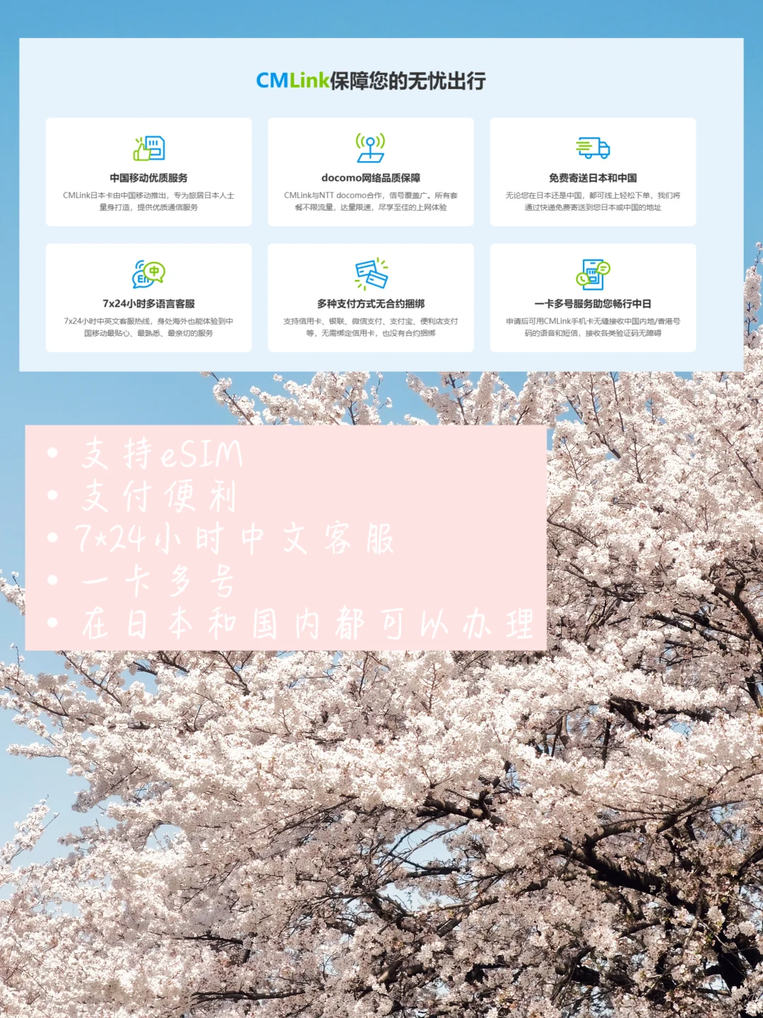 来旅行必不可免的就是需要一张日本电话卡了,给大家推荐CMLink日本手机卡,它支持eSIM和一卡多号。一卡多号办理后可以同步接收国内中国移动号码的来电与信息