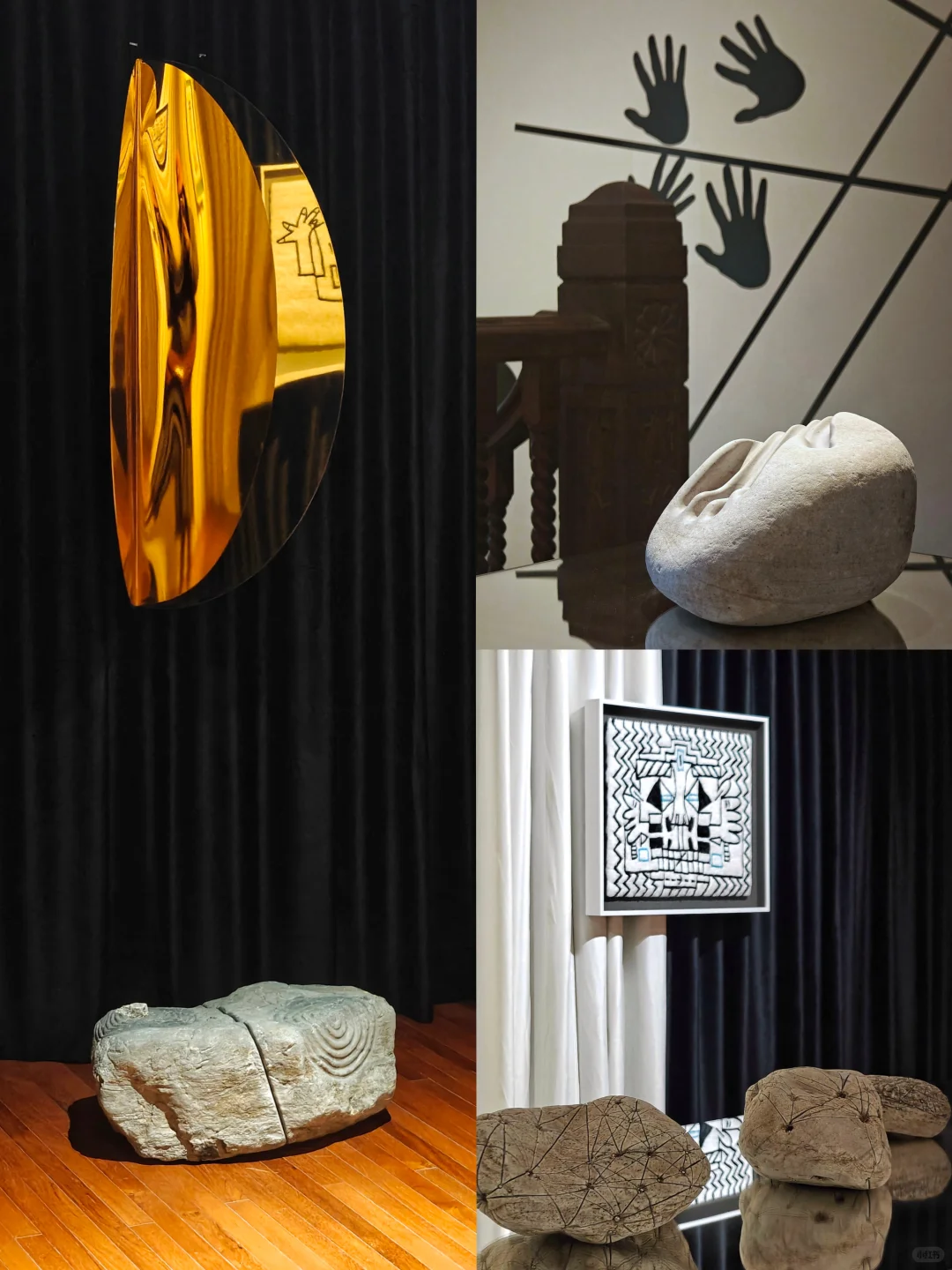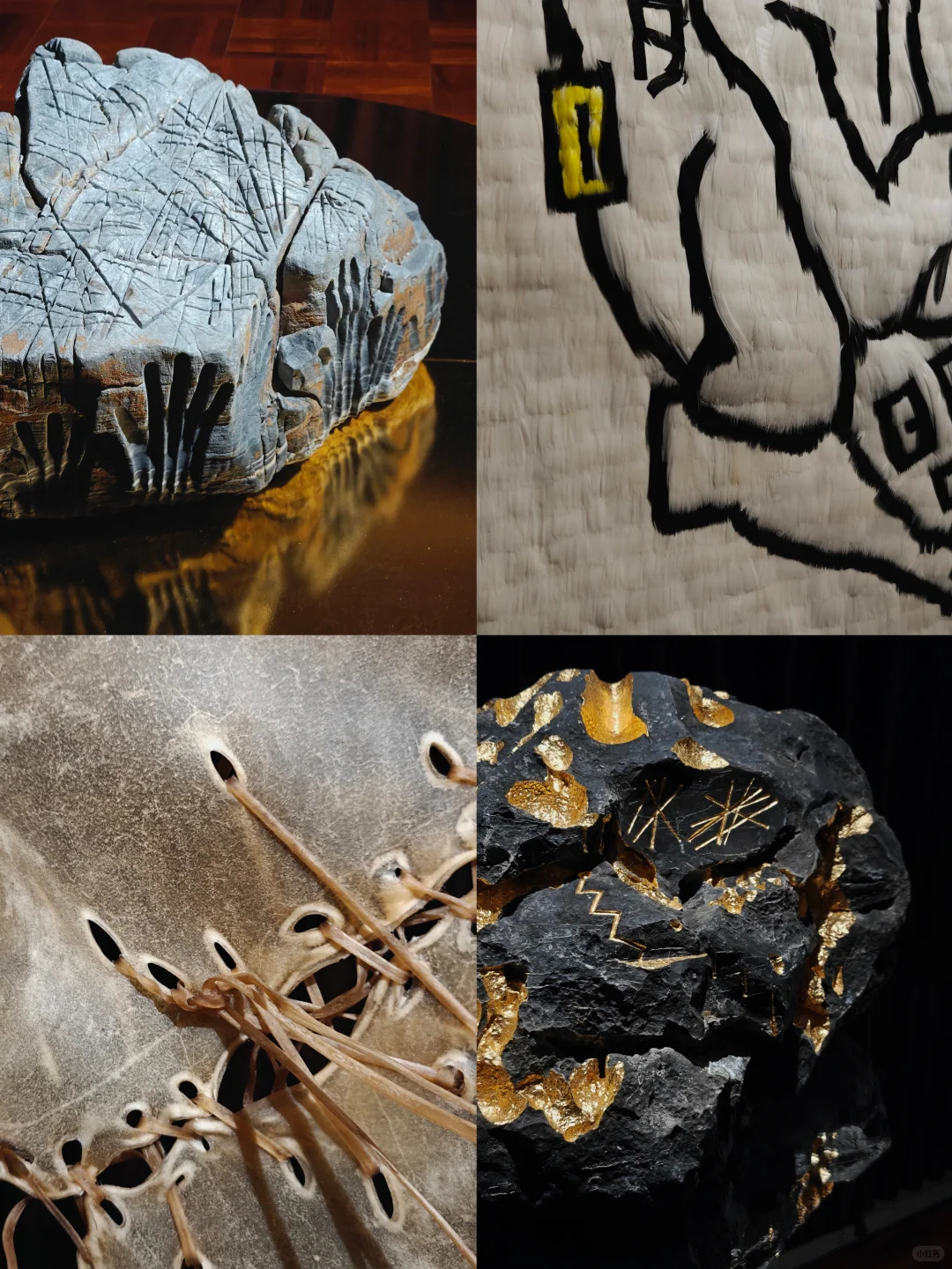 🪶以记忆中“羽毛织成的画面、古怪石块、皮刻面具”等模糊却强烈的感受,作为展览“重现记忆、重温感受”的核心线索