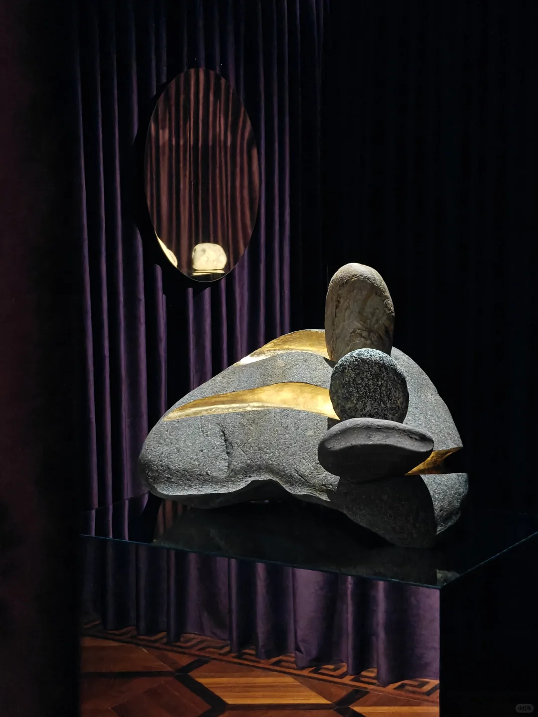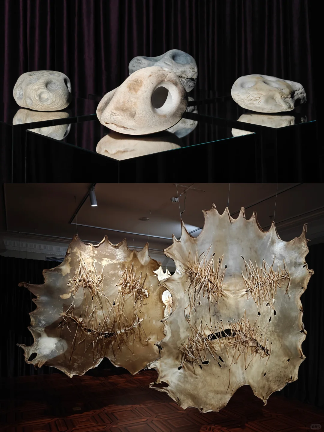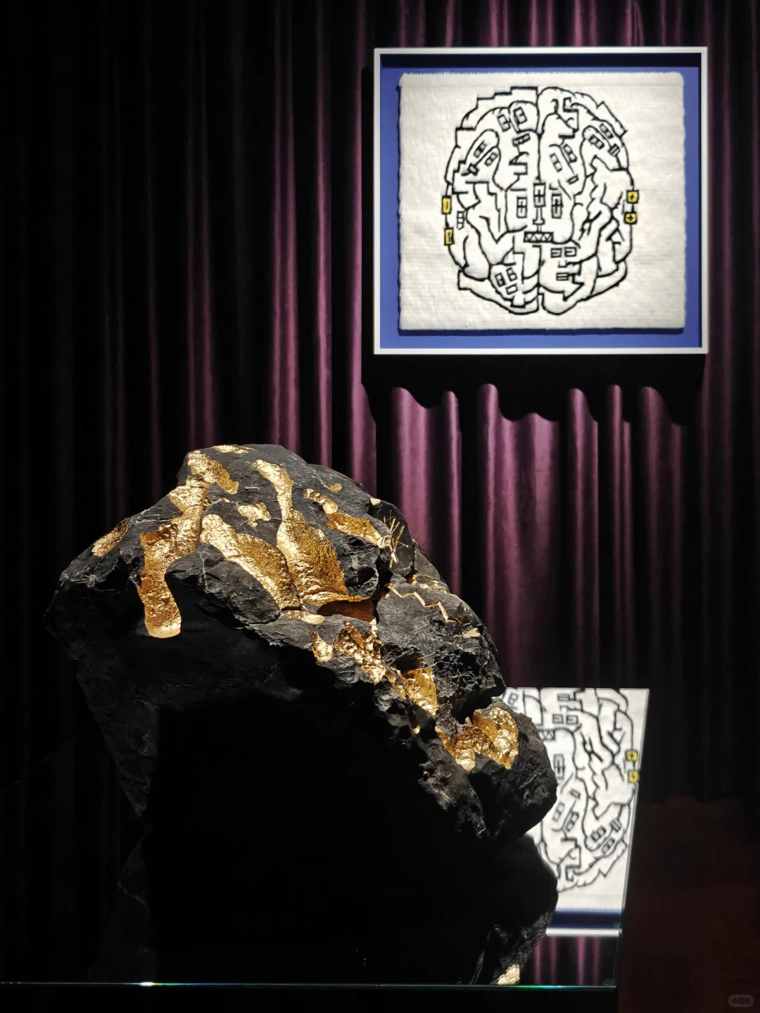 🪶作品采用羽毛、岩石、金属、金箔、皮等媒介,手工密集且物质属性强