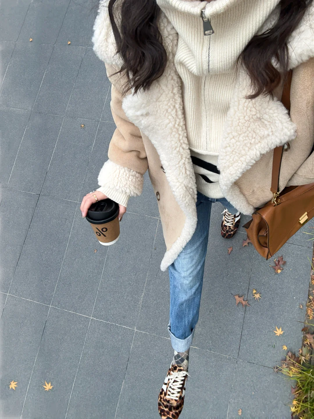 冬日穿搭指南:蓝色西装外套高领毛衣加牛仔裤,保暖又时上!