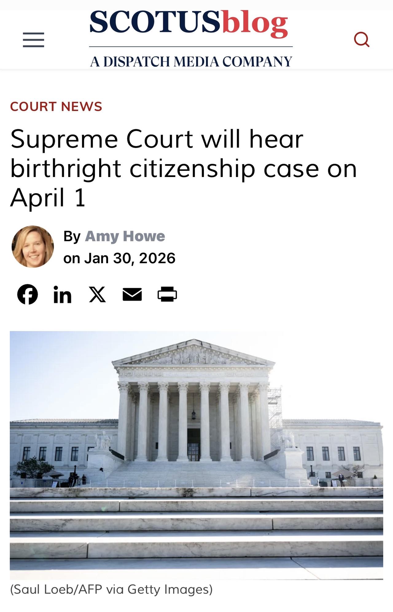 美国最高法院将于4月1日(愚人节)审理有关出生公民权的案件。