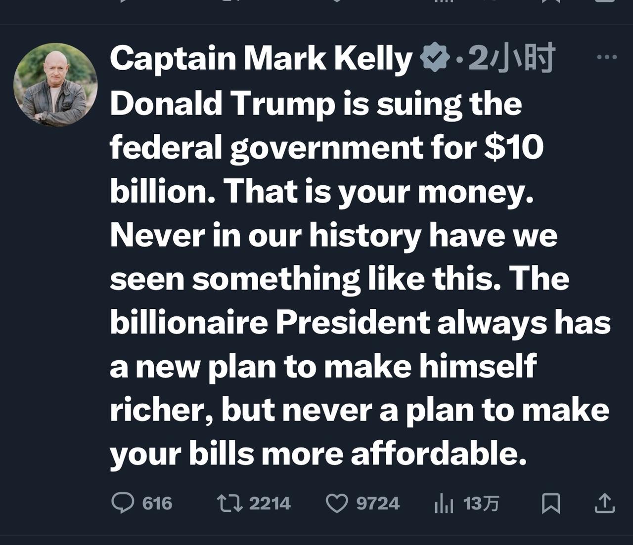 美国亚利桑那州参议员马克.凯利Mark Kelly: “唐纳德·特朗普起诉联邦政府,索赔100亿美元。这可是你们(纳税人)的钱!历史上从未见过这样的事。这位亿万富翁总统总有新的计划让自己更富有,却从未想过如何让你们的账单更实惠。”