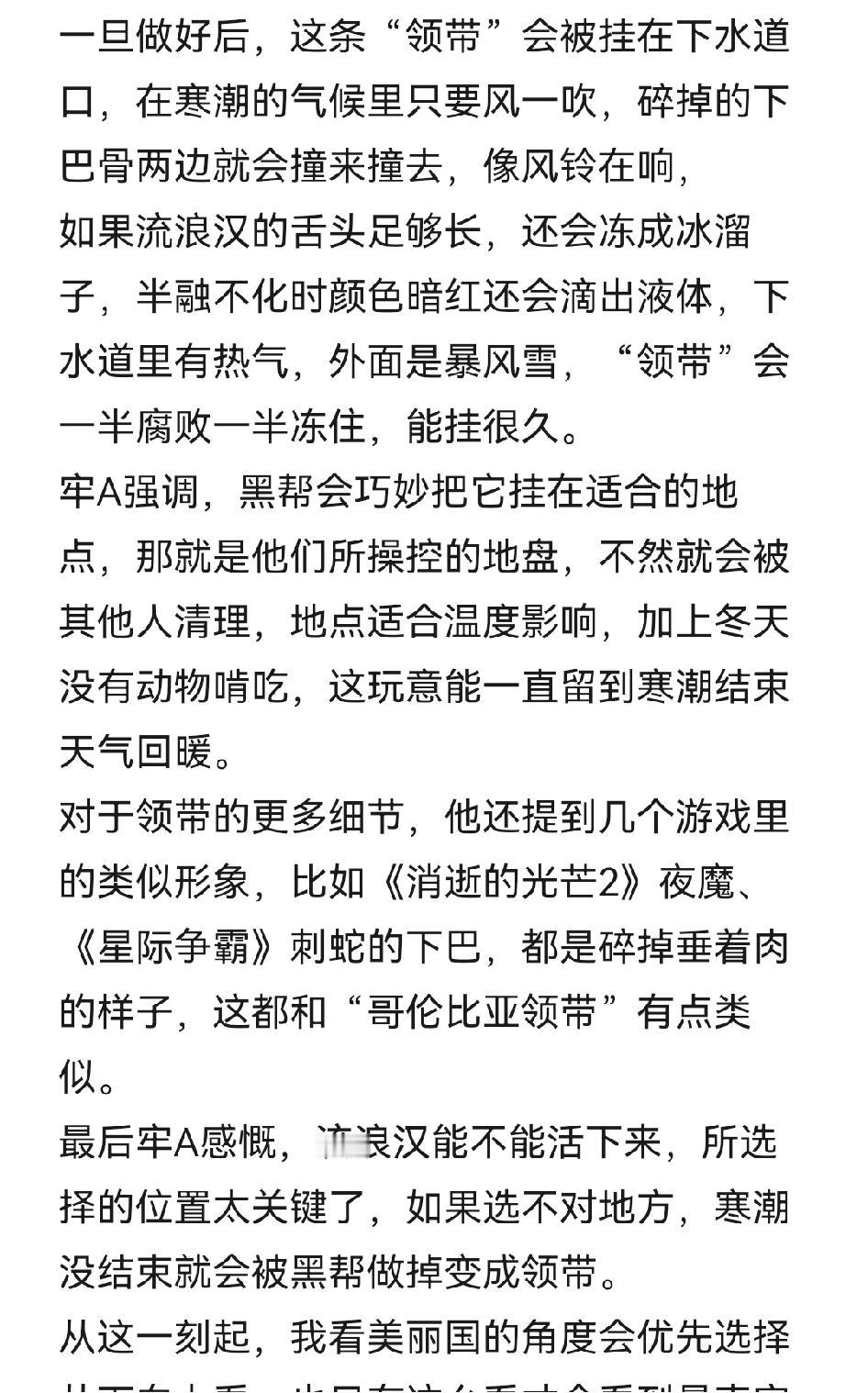 比糖霜苹果还充满“艺术”的“哥伦比亚领带”更常见! 糖霜苹果算啥,真正反胃的是“哥伦比亚领带”,专给流浪汉定制的死亡标签。这“领带”制作好好后会挂在适合的地方,一半腐败一半冷冻,为了警示那些走错下水道的流浪汉。 制作流程堪比《电锯惊魂》,绑椅子+碎下巴舌头外拖,疼到嚎叫响彻下水道。黑帮手工细节,碎颌骨成天然风铃,舌头冻成暗红冰溜子,半腐半冰,寒潮里能挂到开春。 亡灵没下巴、夜魔垂肉刺、刺蛇裂口,全是这条“领带”的二次元远亲。 寒潮来了,只要选错井盖就有可能一键领便当;想看清美利坚,得先蹲下水道往上看——风景真·冰血暴。 牢A爆料美下水道“哥伦比亚领带”:黑帮碎流浪汉下巴,舌头垂胸当风铃,冻成冰溜子挂洞口,警示同行。寒潮选错井盖=死亡标签,真实版《电锯惊魂》。美丽国得从下往上看,才见最寒最暗一面。