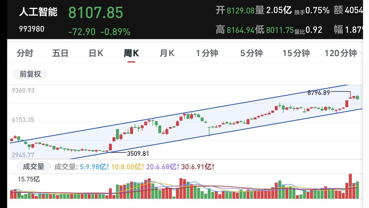 基金:有没有春节红包行情 上周五主力资金净流出935亿,净流出最多的三个板块是:国企板块,蓝筹策略板块,人工智能板块,人工智能板块净流出达到了233亿。 人工智能板块上周五上涨了1.07%,持有人数在所有板块当中排名第11位,这个板块周五上涨幅度排行榜见下面的截图4,上涨幅度最大的是富国创业板人工智能。 看下面的截图5,这是人工智能板块日K线图,现在的位置处于这个日线级别短期下跌通道中,与上下轨的距离差不多,近期观察是突破这个短期下跌通道的上轨线,还是跌破这个下跌通道的下轨线。 看下面的截图6,这是人工智能板块周K线图,现在的位置处于这个上涨通道中,与上下轨的距离也是差不多,暂时的涨跌都影响不了周线级别的上涨趋势,持有的人可以继续持有。 明天市场大概率会是低开,低开以后看在十分钟之内能不能上拉翻红,盘中反弹的时候观察成交量能不能放大,也就是有没有资金进场抢筹,如果还是继续缩量,那大概率就还是一个震荡走势,今天的关键点位是4080点,盘中最好不要跌穿这个点位,如果跌破这个点位而且收不回来,春节红包行情基本上就没有了,如果要有春节红包行情,明天需要低开高走,收盘点位需要在4160点之上,也就是突破下面截图5中下跌通道的上轨线。