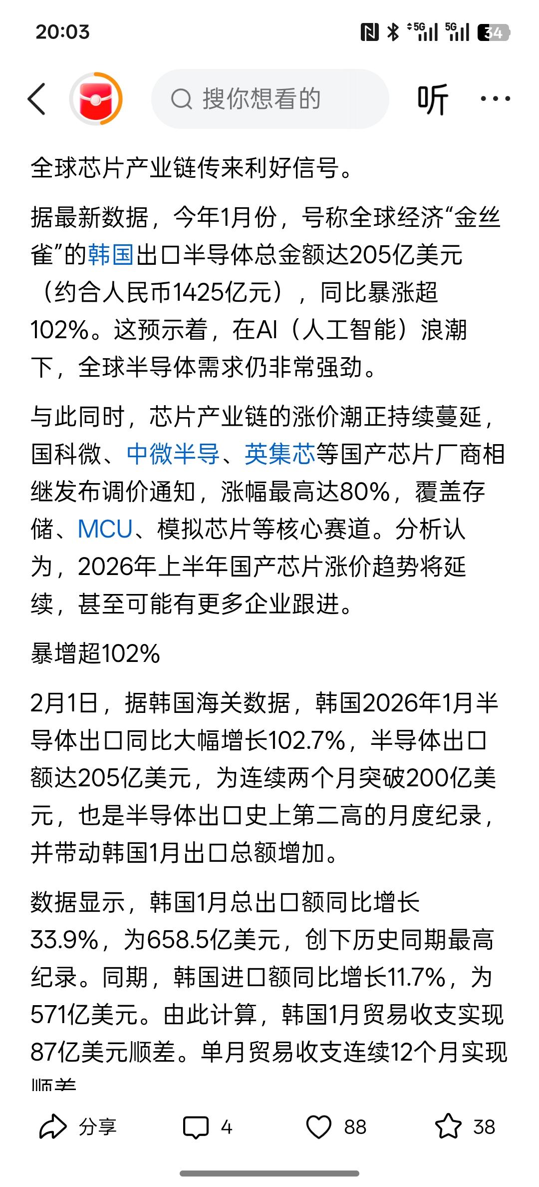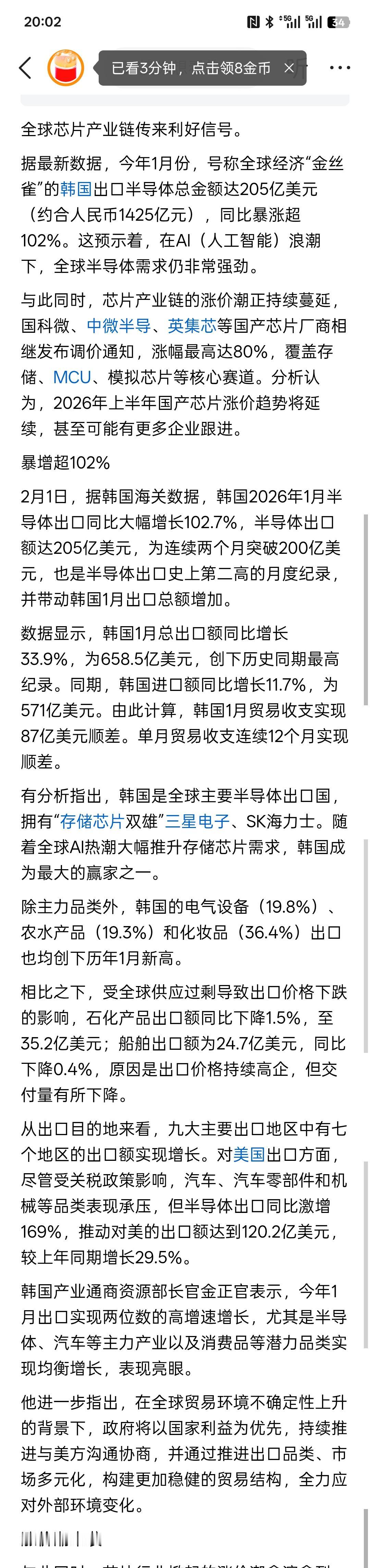暴涨超102%!芯片,重大利好!根据目前的相关数据公布,全球的芯片产业链迎来了新的发展机遇。随着AI人工智能的快速发展,对芯片半导体的需求量大幅增加,而韩国的相关半导体公司利润大幅增长。而根据美国的相关芯片半导体公司发布,上调价格的通知涨幅高达80%左右,要覆盖芯片相对比较广泛,包括存储芯片,模式芯片,这些都是核心赛道! 根据韩国芯片半导体的出口大幅增长,全球对芯片半导体的需求有增无减!