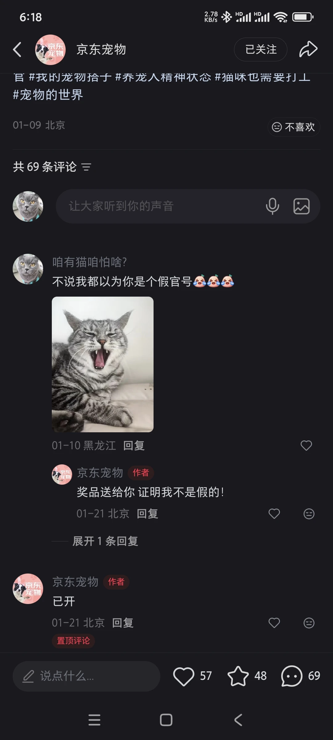 我给你道歉。我再也不说你是假官号了。真官号。嘎嘎真…… 猫粮收到了。 [烟花R][烟花R][烟花R][亲一个R][亲一个R][亲一个R]小猫给你唱首歌:听我说,谢谢你,因为有你……[烟花R][烟花R][烟花R][烟花R] 谢谢京东宠物,谢谢……