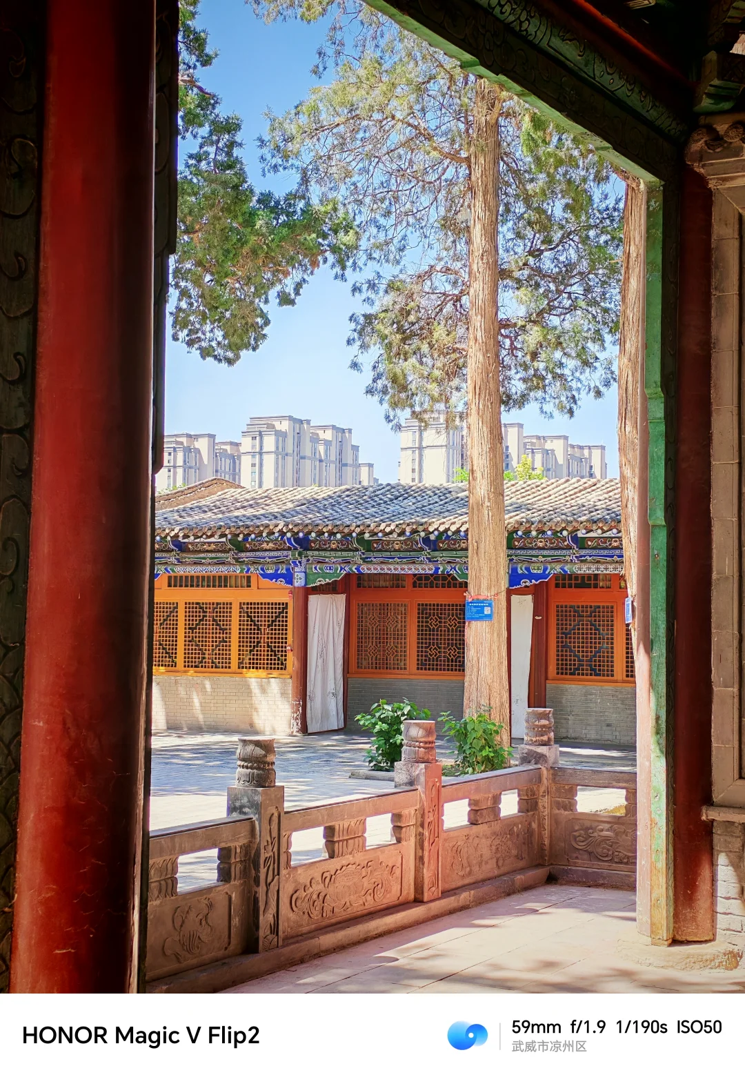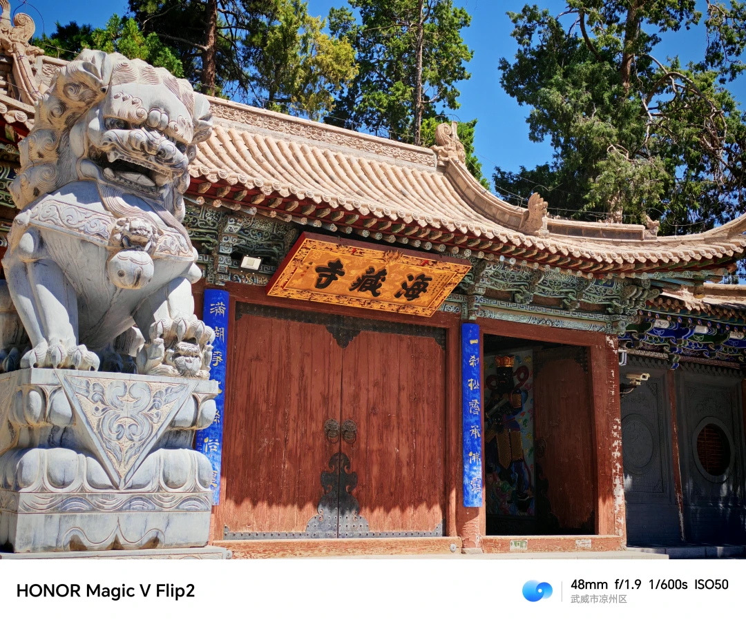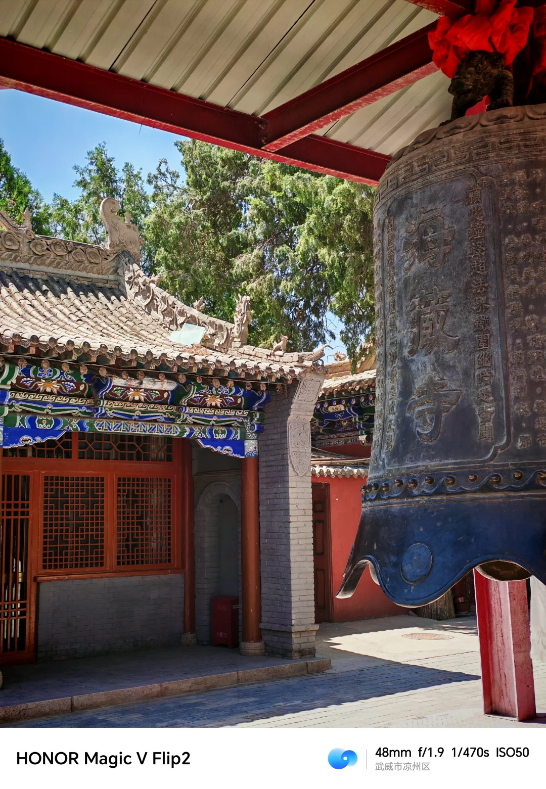 在武威城西北角,藏着一座被历代文人称为"梵宫之冠"的古刹——海藏寺。 正午进寺,酷烈的日光呵退了本就少的游客。带着新一代小折叠自在地逛拍。5500mAh青海湖电池,旅行一天无负担,随时记录沿途景色见闻。2亿超清写真镜头,人像直出也美丽~ 壁画难掩斑驳,树皮藏着沟壑,梁枋磨去棱角……仿佛回到了在山西访古的日子。 凉州是该有这么一座寺,我想。