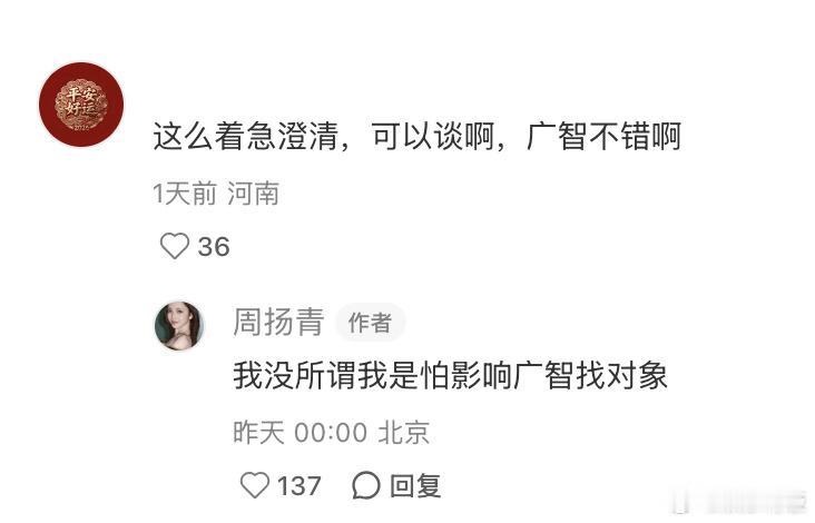 周扬青辟谣与何广智恋情 怕耽误对方找对象 周扬青这波辟谣也太可爱了!分享的vlog里和何广智一起练脱口秀同框超欢乐,转头就光速澄清两人恋情传闻,还暖心直言怕影响对方找对象~主打一个坦坦荡荡,网友也忍不住调侃:这关系都到需要专门澄清的地步了,多少有点甜啊!同框氛围感拉满,纯友谊也超好磕!