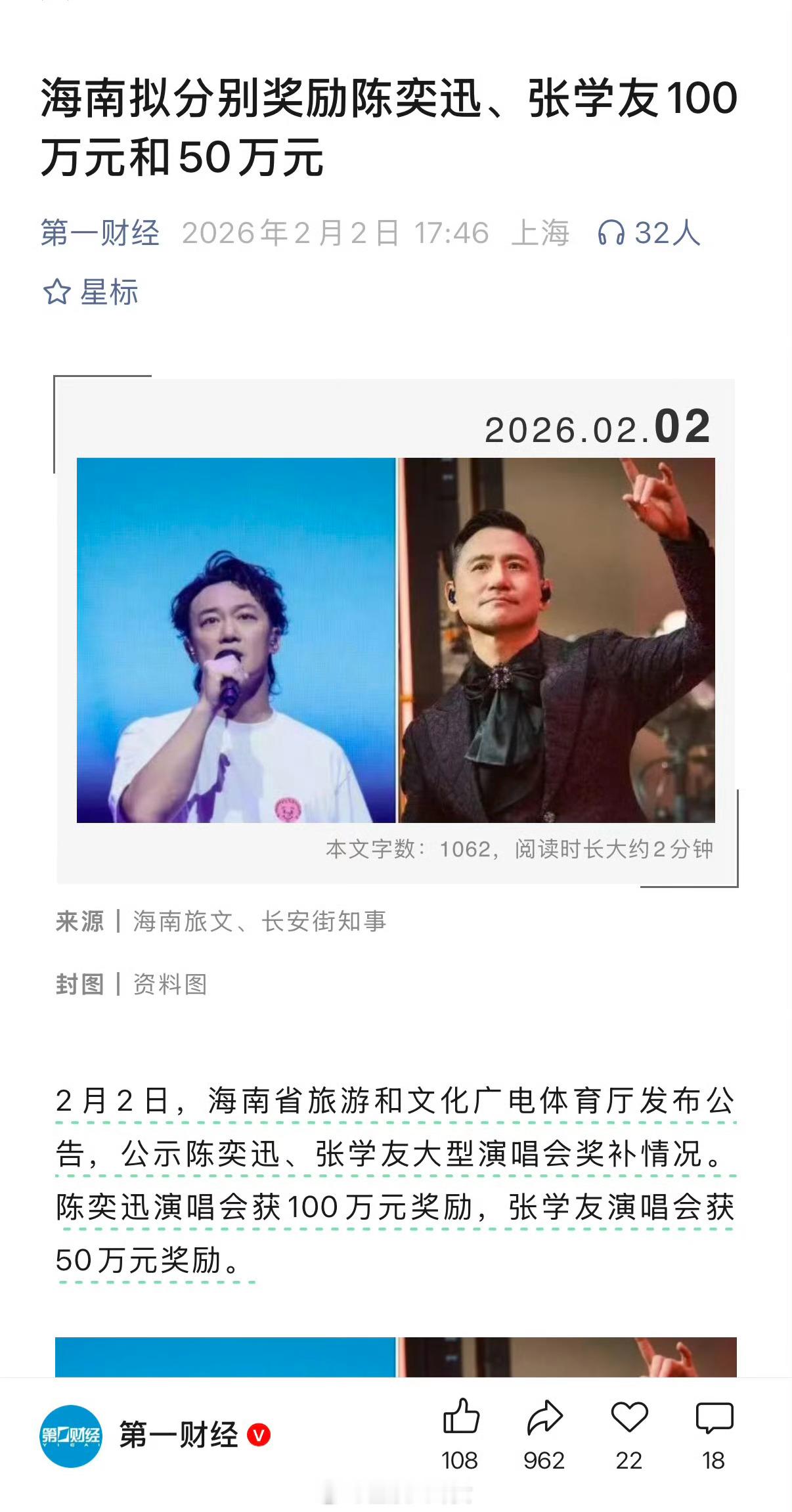 海南拟分别奖励陈奕迅、张学友100万元和50万元……评论区亮了