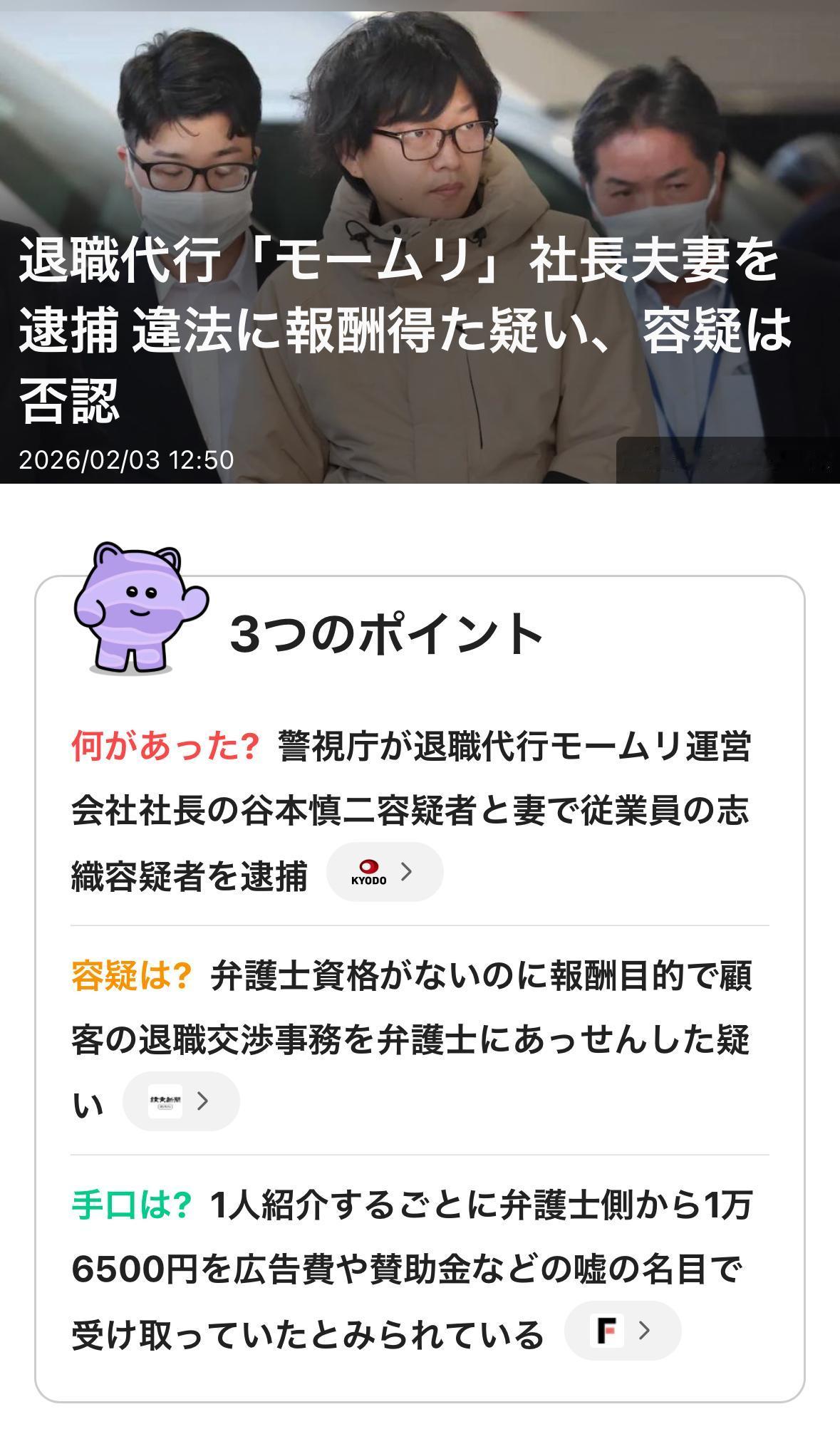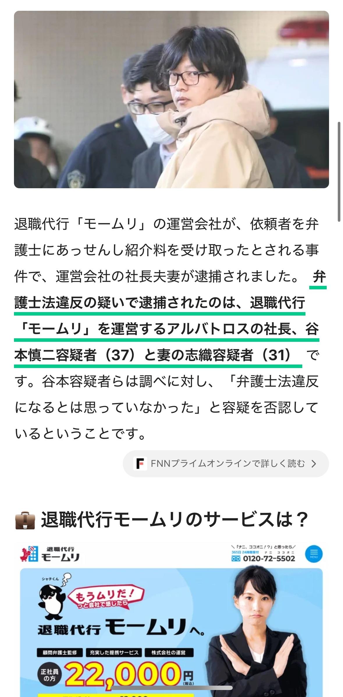 离职代办公司"モームリ"负责人夫妇因涉嫌违反《律师法》被捕 运营离职代办服务"モームリ"的公司アルバトロス社长夫妇因涉嫌将客户介绍给律师并收取介绍费,于近日被警方逮捕。 因涉嫌违反《律师法》而被捕的是アルバトロス公司社长谷本慎二(37岁)及其妻子谷本志织(31岁)。面对调查,谷本慎二等嫌疑人否认了指控,称"(当时)不认为此举违反了《律师法》"。