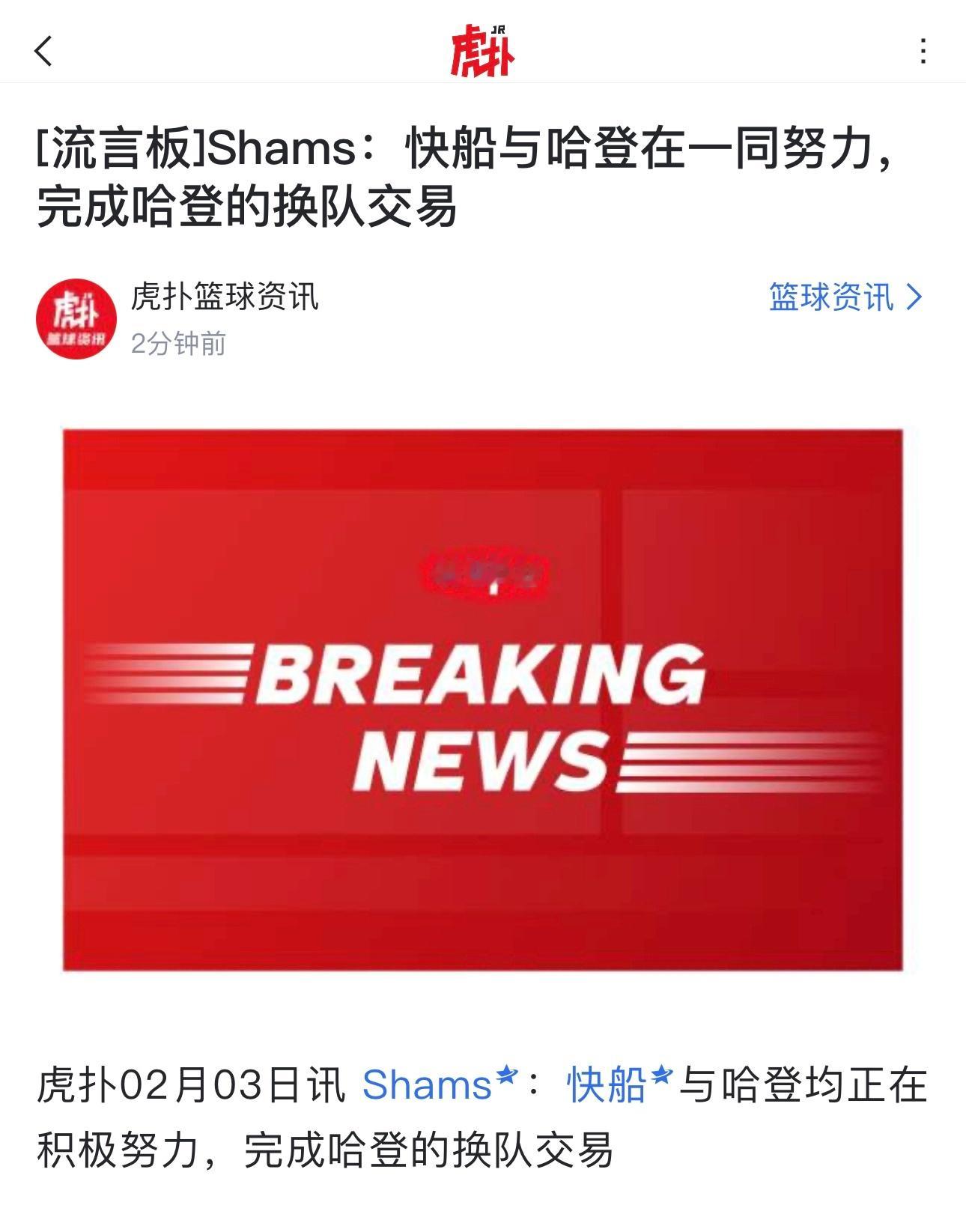 ESPN记者Shams:据消息人士透露,洛杉矶快船队已将詹姆斯·哈登交易至克利夫
