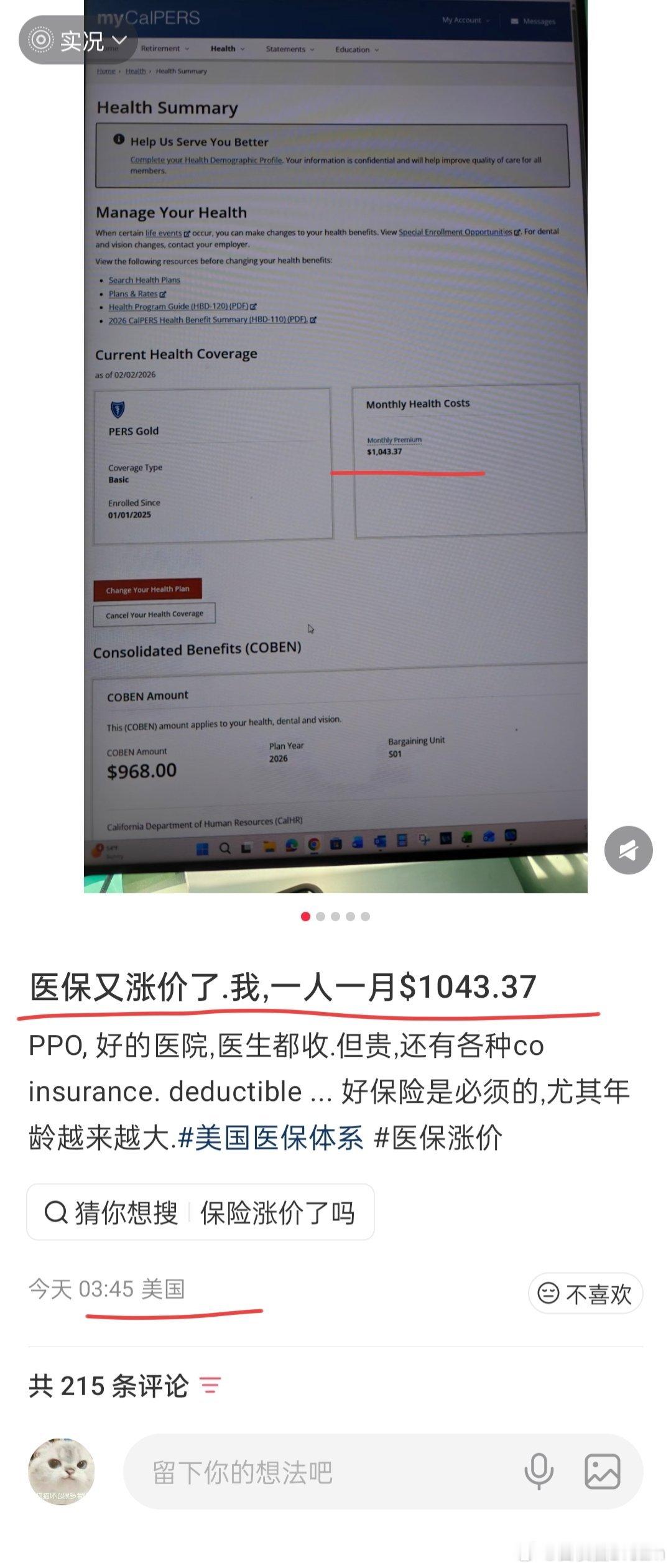 🔻美国医保又涨价了,一人一月1000美刀。🔻这是美国斩杀线还是美国地狱?🔻400一年新农合的含金量还在上升!牢A称地狱它也分十八层海外新鲜事