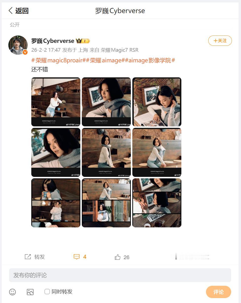 荣耀Magic8 Pro Air虽然外观轻薄便携,但是整机性能和影像能力是一点也不弱,人像写真也靠谱,刚刚看到荣耀首席影像工程师罗巍, 分享了一组利用这款机型拍摄的人像写真,木质阶梯式结构的室内环境,搭配简约干净服饰,在复杂光线下人物依然轮廓清晰、肤色自然,续航部分也蛮舒服,大家觉得怎么样呢? 畅聊数码新品 数码资讯