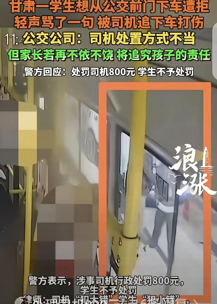 甘肃,一16岁男孩坐公交车,他想从前门下车,司机不让,男孩轻声骂了一句,被司机追下车打了一顿,男孩父亲愤怒报警,说儿子出现"急性应激反应"患上重度焦虑症,构成轻微伤,要求司机赔钱,并支付精神抚慰金。不料,公交公司回应:司机不对,但家长如果再不依不饶,将追究孩子的责任。 一16岁男孩坐公交车,他性子有点急,车子快到站时,他想着从靠近自己的前门下车能快点,就径直朝着前门走去。司机正全神贯注地开着车,从后视镜里看到晓峰往前门走,立马扯着嗓子喊道:"后门下!前门不能下!" 男孩心里正想着事儿呢,被这突如其来的一嗓子吓了一跳,脚步顿了一下,但还是小声骂了一句,表达自己的不满。被骂后的司机,心里"腾"地一下火就上来了。 他每天开车,需要聚精会神,保证一车乘客安全,本来就压力大,遇到这种不守规矩还骂人的乘客,更是气不打一处来。车子刚停稳,老李就解开安全带,冲下车去。晓峰还没反应过来怎么回事,老李已经到了他跟前,一把揪住他的衣领,嘴里骂骂咧咧:"你个小兔崽子,骂谁呢!"接着打了男孩的头。 男孩又惊又怕,看着司机凶神恶煞的面孔,吓坏了,他想挣脱却挣脱不开,只能结结巴巴地说:"我......我没骂你。"司机哪肯放过他,抬手就给了男孩几拳。 男孩被打得眼冒金星,脸上火辣辣地疼,眼泪在眼眶里直打转。这时,周围围过来一些路人,纷纷指责不该打人。司机这才松开手。 男孩哭着跑回家跟父亲说这事,父亲一看孩子脸上的红肿,气得当即报警。检查结果出来,孩子是轻微伤,还因为这场冲突患上重度焦虑,有了急性应激反应。 父亲要求司机赔偿医药费,还得给精神抚慰金,这诉求搁谁身上都能理解。可公交公司的回应挺让人意外,承认司机动手不对,但话里话外透着威胁,说家长要是不依不饶,就追究孩子骂人的责任。 这事儿闹到网上,大伙都议论开了。男孩前门下车不合规矩,小声骂人确实不对,该教育,但司机作为成年人,动手打未成年,性质就变了,责任肯定更大。公共服务行业,控制情绪是基本素养,再委屈也不能用拳头解决问题。各位读者你们怎么看?欢迎在评论区讨论。