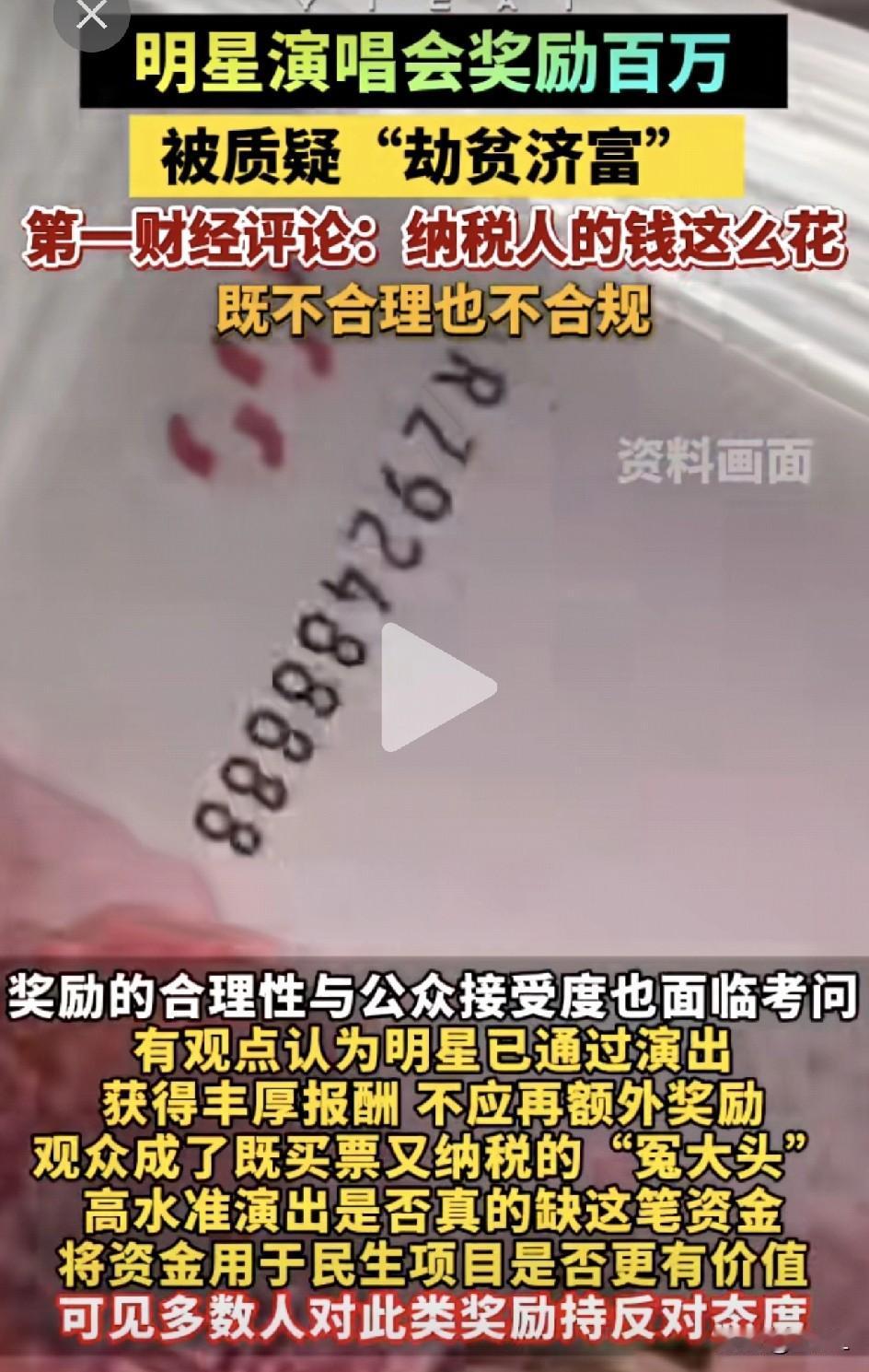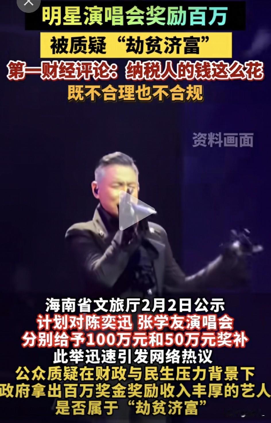 地方政府掏百万奖金给来开演唱会的明星?网友炸锅:这是否就是传说中的“劫贫济富”?奖金到底该不该发? 近日,海南一则奖励公告直接引爆了全网,引起了广大网友的热议:陈奕迅演唱会获政府奖励100万元,张学友演唱会获奖励50万元。 消息一出,不少网友第一反应是: “明星演唱会赚钱,凭什么还要纳税人给奖金?” “财政不紧张吗?民生支出不花钱吗?” “给明星如此锦上添花,不如拿去给老百姓雪中送炭!” 原来,这是依据当地现有政策给的奖励。陈奕迅演唱会售票超3.8万人次,收入约6747万元,达到了奖励标准。 但规定归规定,大家心里却冒出更多疑问: “奖励明星,是不是变相“劫贫济富”?” “国家《营业性演出管理条例》不是明令禁止政府资助、赞助演出吗?” “给明星发百万奖金,为什么不拿去改善民生、教育医疗?” 更有网友直言: “明星已经凭实力赚了门票钱,政府再来发奖,这不等于观众既买票又出税?” 也有冷静声音提醒: “地方政策若与国家规定不符,应当调整。奖励虽能吸引演出、带动旅游,但方式值得商榷。” “明星本就是高收入人群,给他们发奖金不如冠以荣誉名片更恰当!” “我是学友的铁粉,依然觉着这奖金既不合理又不合规!” 目前,这笔奖励还在公示阶段。 大众的质疑,恰恰是重新审视政策合理性的好时机——花纳税人的钱,不仅要合法,更要合情合理,真正对得起大家的期待。 公众,需要一个合理的答复! 你怎么看?欢迎留言讨论! 素材来源:第一财经,侵联删!