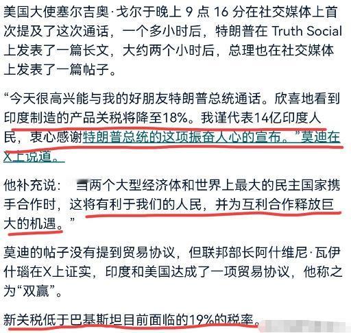 印度竟然感觉自己赢了!只要比巴基斯坦条件好,印度就是赢了!美国和印度的关税问题谈成,在我们看来,印度这明显是向美国屈服了,美国把关税25%降到18%,惩罚性的25%取消换取印度停止采购俄罗斯石油,印度还要将对美关税降至零,并购买价值超过5000亿美元的美国商品等等。但是印度国内是怎么看待这事的呢? 先说关税数字。18%的税率,在印度媒体的标题里,永远跟着括号注明“低于巴基斯坦19%”。这种对比在南亚政治语境里太重要了——过去十年,印度每次调整关税都要盯着巴基斯坦的数字,就像邻居家孩子考了60分,自己考59都觉得输。 这次美方把原本惩罚性的50%砍到18%,虽然是被迫让步,但莫迪政府立刻把数字裱起来:看,我们对美关税比死对头还低!这种“赢过巴基斯坦”的心理补偿,足以让很多印度民众忽略协议背后的代价。 再说技术焦虑。印度制造业有个老心病:2014年莫迪喊出“印度制造”,结果十年过去,工业增加值占GDP比重还在25%打转。美国这次松口的18%关税,被包装成“印度制造进军美国市场的门票”。 尤其是半导体、航空部件这些领域,印度官员私下承认,美方承诺的技术转让,比关税数字更解渴。 就像德里的一位经济学家说的:“我们不是买石油,是用能源订单换波音的生产线。”这种错位的等价交换,在印度精英层形成共识——牺牲短期利益,换长期技术入场券。 还有俄油的算盘。表面上印度答应停购俄油,实际去年通过阿联酋转口的俄油量反而涨了37%。孟买的炼油厂把俄油加工成柴油,再高价卖给欧洲,一桶净赚23美元。 这种“曲线救国”的操作,让印度舆论觉得:美国人要的面子给了,但里子没丢。莫迪政府甚至把这事当政绩——既能安抚国内反美情绪,又能继续赚欧洲的钱,何乐而不为? 更关键的是国内政治账。2024年大选时,莫迪靠“强硬对美”的口号拉票,结果2025年被加征50%关税,导致纺织业损失120万个岗位。 这次协议把税率砍回18%,直接救活了古吉拉特邦的2000家中小企业。印度媒体算过账:这些企业雇的都是低种姓工人,保住饭碗比什么都重要。所以莫迪在推特上感谢特朗普,本质是给选民看的——你们骂我让步,但工厂冒烟了,选票才稳了。 最后是战略定位的幻觉。印度精英层有种根深蒂固的认知:美国需要印度制衡中国,所以任何协议都是“互相利用”。他们选择性忽略美方的胁迫,只盯着协议里“共同开发5G技术”“联合研制无人机”的条款。 新德里政策研究中心的报告直言:“就算当美国的棋子,也是带枪的棋子。”这种阿Q式的自我说服,让印度舆论普遍认为:我们不是屈服,是在大国博弈中找到了自己的价位。 所以你看,印度的“胜利”,本质是数字游戏、技术焦虑、经济现实和政治算计的混合体。他们不是看不见协议的不平等,而是在现有条件下,抓住了最能说服自己的那根稻草——比巴基斯坦强,比去年好,比不签协议有盼头。这种务实到近乎狡黠的生存智慧,或许就是南亚次大陆独特的政治逻辑。