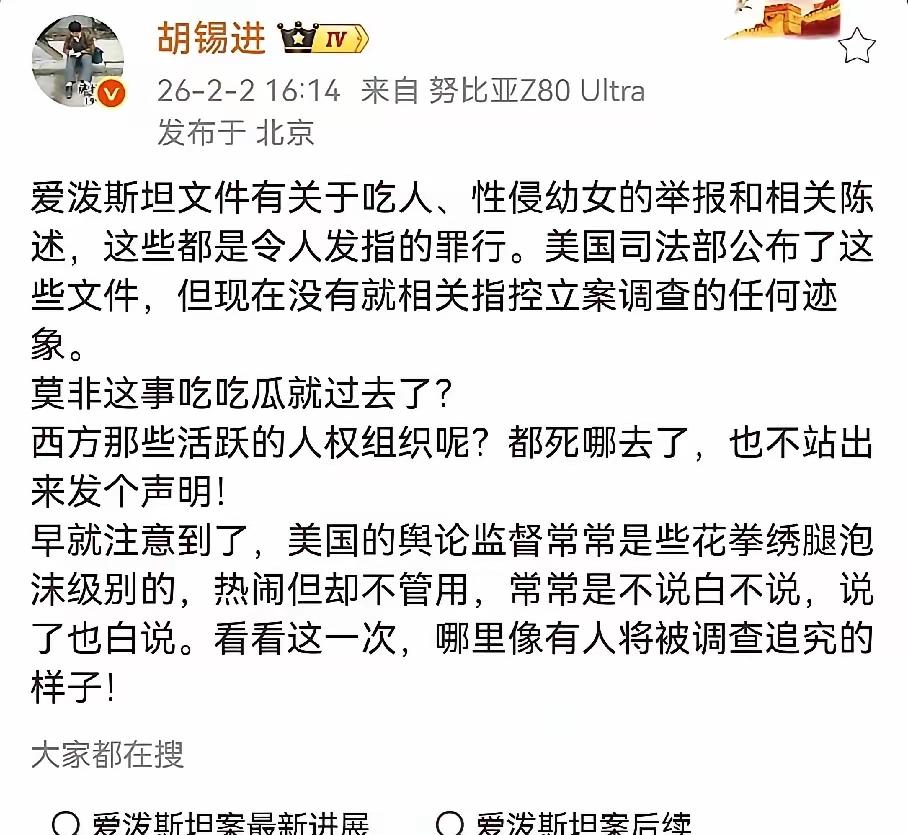 300万页“爱泼斯坦档案”一公开,导致公知大V道心崩塌,赶忙着连夜删帖,头像统一换红旗,评论区秒变“爱国阵地”。 网友扒出他们往年舔美旧文,标题《自由的空气》现在看像恐怖片预告,阅读量成大型社死现场。 有人爆料:某位以“民主启蒙”起家的KOL,曾私下打听“上岛门槛”,如今秒怂“我身体差,晕船”。 心理学总结:当狗发现骨头里包毒,跑得比兔子还快;他们不是觉醒,只是怕成为菜单。 档案里出现的中文名虽打码,也让半吊子精英悟了:在资本修罗场,黄皮肤永远坐不了主桌,只能当配菜。 小编结语:道心破碎不是良心发现,而是发现“自由派对”入场券写着“可能上桌”。真正的信仰靠文档打脸才回头,那叫投机。想稳,先把膝盖从美元汇率里拔出来,再谈独立人格。毕竟,灯塔底座是尸骨,不是红毯。