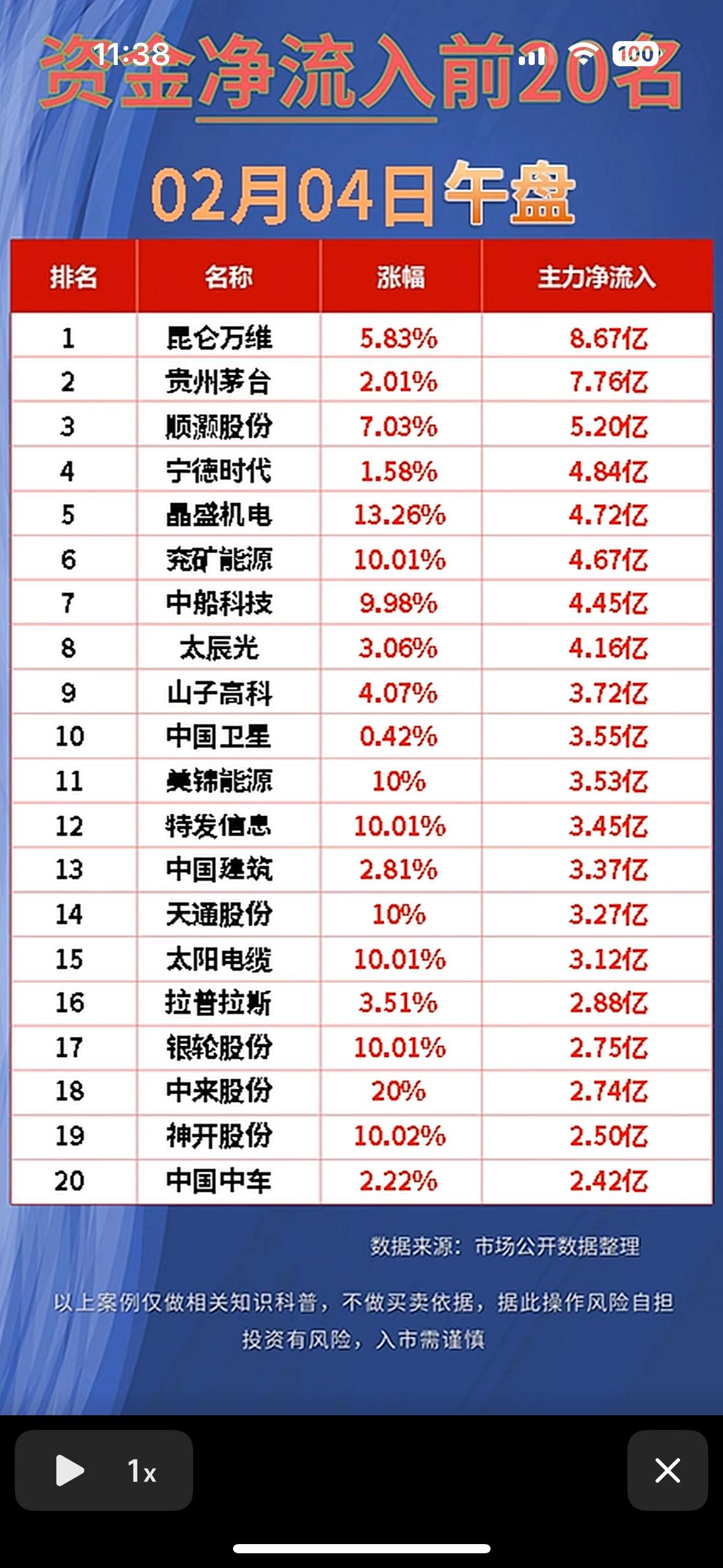 2026年2月4日午盘资金净流入前20名股票排行榜 股市午盘资金动向:昆仑万维领涨吸金,茅台、宁德等龙头股获主力青睐,能源科技板块活跃