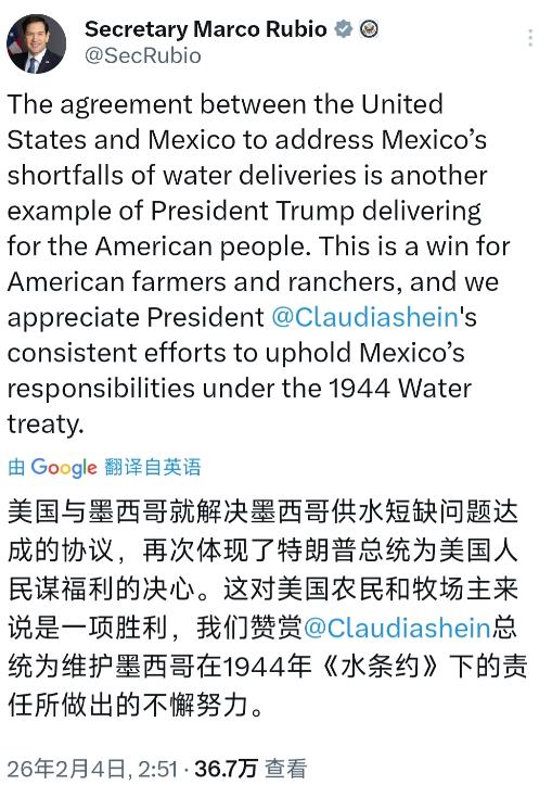 美国国务卿鲁比奥今天(北京时间2月4日)发文写道:“美国与墨西哥就解决墨西哥供水短缺问题达成的协议,再次体现了特朗普总统为美国人民谋福利的决心。这对美国农民和牧场主来说是一项胜利,我们赞赏辛鲍姆总统为维护墨西哥在1944年《水条约》下的责任所做出的不懈努力。” 美国国务卿鲁比奥在社交媒体上提到的美墨供水协议,本质上是两国在跨境水资源分配上的一次利益博弈。这份协议的达成,既体现了特朗普政府一贯的强硬谈判风格,也反映了墨西哥在干旱危机下的现实妥协。 根据1944年签订的《水条约》,墨西哥每五年需向美国输送北布拉沃河(美方称格兰德河)干流三分之一的水量,但近年来受气候变化影响,墨西哥连续三年遭遇严重干旱,全国85%的地区陷入缺水困境,导致其履约能力大幅下降。 在此背景下,特朗普政府通过关税威胁等手段施压,最终迫使墨西哥承诺每年向美国输送至少35万英亩-英尺的水量,并制定计划偿还历史欠账。 从美国的角度看,这份协议确实为得克萨斯州南部的农业提供了关键支持。该地区是美国重要的棉花、柑橘和蔬菜产区,但近年来因墨西哥供水不足,部分农田被迫休耕,甚至导致当地唯一的糖厂关闭。 协议的达成不仅缓解了当前的灌溉压力,还为未来五年的农业生产提供了相对稳定的水源保障。鲁比奥强调这是“特朗普总统为美国人民谋福利的决心”,实际上是将跨境水资源问题政治化,通过塑造“保护本国利益”的形象来巩固国内政治支持。 对于墨西哥而言,辛鲍姆政府的妥协实属无奈之举。尽管墨方多次强调需优先保障本国民生用水,但在美方的关税威胁下,不得不调整水资源分配策略。 根据协议,墨西哥需在满足国内基本需求的前提下,优先向美国输送约定水量,这可能进一步加剧其北部地区的缺水危机。值得注意的是,墨西哥在协议中争取到了一定的灵活性,例如允许根据实际储水量和输送能力分期偿还欠账,这在一定程度上减轻了其履约压力。 然而,协议的执行仍面临多重挑战。首先是气候因素,墨西哥目前全国210座主要水库均未达到满库容状态,部分水库蓄水量不足历史平均水平的一半。若未来干旱持续,墨西哥可能难以兑现供水承诺。 其次是基础设施问题,墨西哥的水利设施老化严重,输水过程中的损耗率较高,这也影响了实际供水量。此外,墨西哥国内对协议的争议较大,北部农业州的农民担心政府为履约过度抽取本地水源,可能引发新的社会矛盾。 从长远来看,美墨之间的水资源争端本质上是跨境资源分配机制未能适应气候变化的结果。1944年的《水条约》签订时,双方并未预见到全球变暖对干旱频率和强度的显著影响,也未建立灵活的水量调整机制。 尽管此次协议暂时缓解了危机,但要彻底解决问题,两国需在技术合作、基础设施升级和条约修订等方面展开更深入的对话。例如,墨西哥可借鉴中国在节水灌溉和地下水管理方面的经验,提升水资源利用效率;美国则应考虑向墨西哥提供技术援助,帮助其改善水利设施,从而实现可持续的水资源共享。 这份协议是美墨两国在现实压力下的一次妥协,既体现了美国在跨境谈判中的强势地位,也暴露了墨西哥在气候危机面前的脆弱性。 对于美国农民和牧场主而言,协议带来的短期利益值得肯定,但从全球水资源治理的角度看,如何建立更公平、更具弹性的分配机制,才是解决类似争端的根本之道。