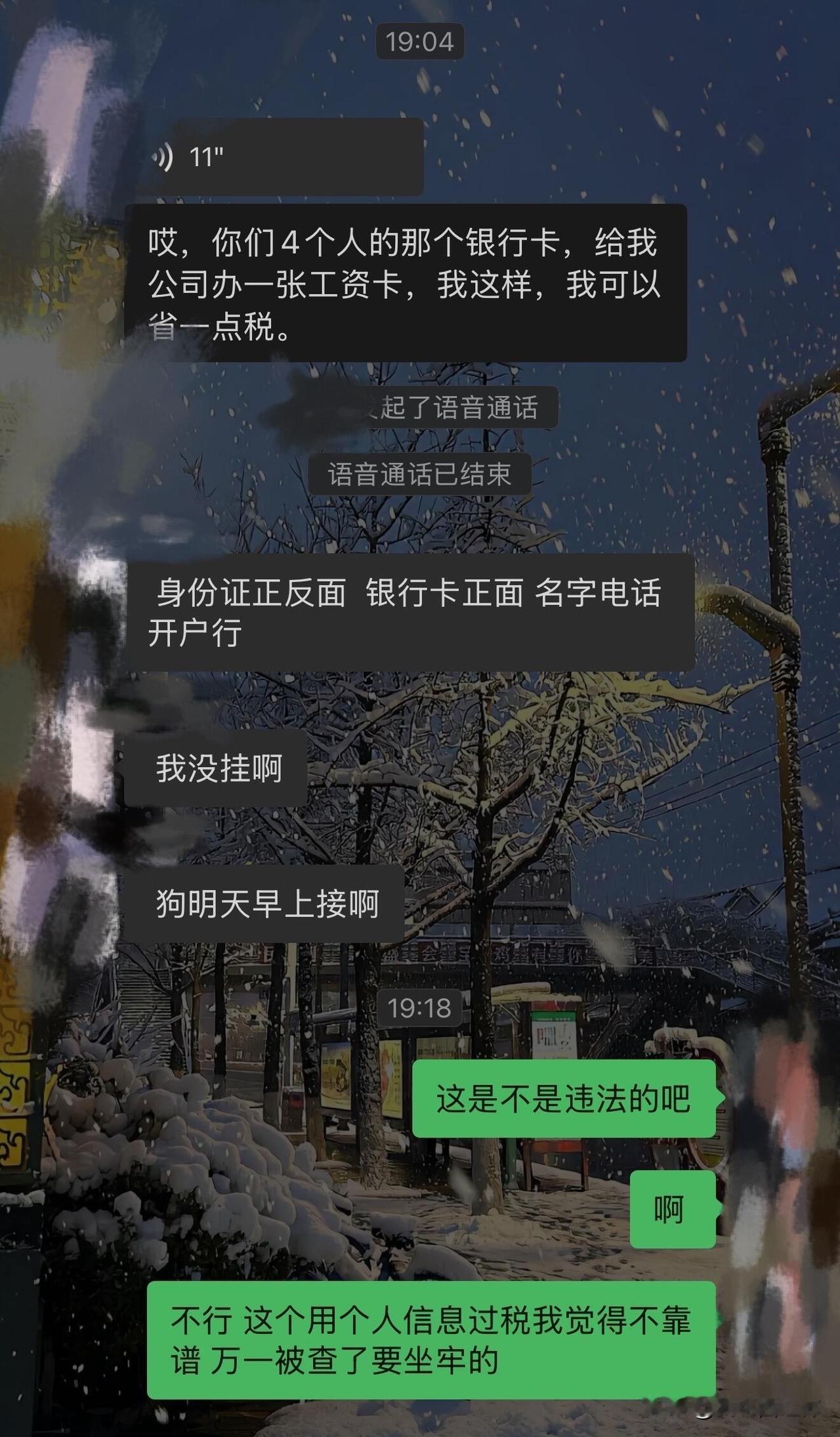 朋友要我的身份证正反面和银行卡信息 一起玩了二十年的发小 在群里要我和我老公还有另一个朋友跟她老公的银行卡 说给她公司办工资卡 可以省一点税 然后打电话来另个朋友没接 我接了 我当时就问靠不靠谱 她说放心 玩了这么多年还会坑你吗 还叫我别和我老公要了 说我信她不代表我老公信她 我没想那么多就答应了 挂了电话以后她让我发身份证正反面和银行卡信息 我就警惕起来了 毕竟这关乎到个人信息隐私安全的问题 我就上网查了一下 然后就拒绝了 接着她给我的回复让我觉得她在把我当傻子 并且说话很冲 让我心里特别不舒服 想问问大家我这么做是太伤多年朋友感情和心思重吗