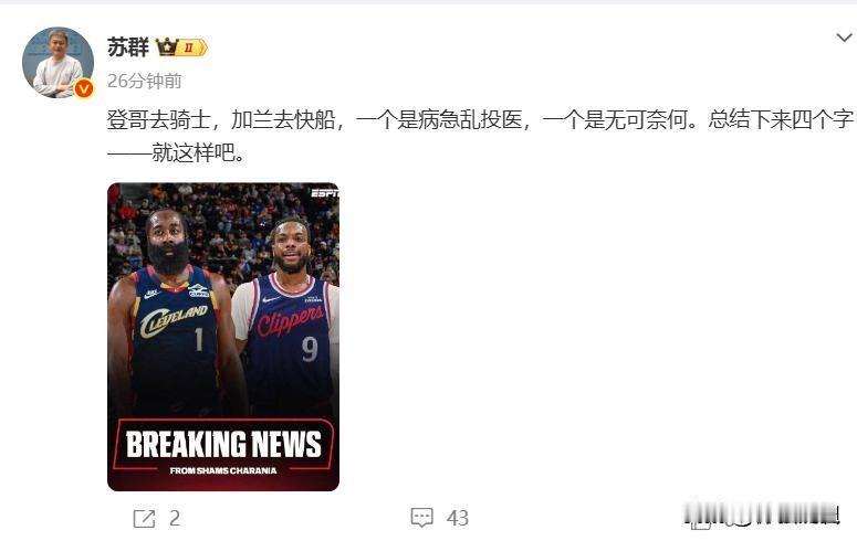 2月4日,快船和骑士达成1换2大交易,用哈登换加兰和次轮签!接下来,接近37岁的哈登迎来新阶段,克利夫兰会是他职业生涯的最后一站吗?在6年时间内,哈登为5支球队效力,到了职业生涯末期,他也是换队最频繁的超级球星之一,从这点来看,库里的一人一城确实弥足珍贵了![送心] 就在今天,NBA交易市场在截止日前掀起巨浪。 洛杉矶快船队与克利夫兰骑士队达成了一笔重磅交易,快船将詹姆斯·哈登送往克利夫兰,从骑士换来了达里厄斯·加兰和一个未来的次轮选秀权。 为了促成交易,哈登放弃了自己合同中的交易否决权以及约230万美元的交易补偿金。 这笔交易的核心,是一位36岁的前MVP与一位26岁正值当打之年的全明星后卫的互换。对于哈登而言,克利夫兰将是他近六年内效力的第五支球队,这次东游的目标直指总冠军。 本赛季他代表快船出战44场,依然能贡献场均25.4分、4.8个篮板和8.1次助攻的全面数据。 骑士队做出这次豪赌的动机非常明确,那就是提升即战力,抓住当下的夺冠窗口。球队目前以30胜21负的战绩位列东部第五,拥有多诺万·米切尔、埃文·莫布利和贾莱特·阿伦的核心框架。 但上赛季季后赛的失利表明,他们距离顶级强队还差一口气。用更年轻但季后赛表现起伏的加兰,换取经验丰富、擅长组织的哈登,是一次针对性的升级。米切尔本人对哈登的加盟表示欢迎,认为后者丰富的经验能减轻自己在组织进攻方面的压力。 交易后,骑士队的首发阵容预计将变为哈登、米切尔、杰隆·泰森、莫布利和阿伦,后场的高度和进攻创造力得到显著提升。 不过,这笔交易也让骑士队的阵容出现“头重脚轻”的现象,球队名单中后卫多达9人,而锋线深度则相对薄弱。有报道指出,骑士管理层可能仍有后续动作,不排除继续追求更高层级球星的可能性。 站在快船的角度,这笔交易标志着一次方向的调整。送出还有巨大即战力的哈登,换来更年轻的加兰和一个选秀权,既有对未来的投资,也有一丝无奈。 快船本赛季战绩仅为23胜26负,自2021年以来未能突破季后赛首轮,本赛季甚至可能面临无缘季后赛的风险。 加兰的到来能为球队后场带来新的活力,他本赛季场均18.0分和6.9次助攻的数据依然亮眼,尽管他自1月中旬以来因伤缺阵。这次换血,或许是为了围绕科怀·伦纳德构建一套更年轻、更具长期性的阵容。 对于两位主角而言,这次换队是职业生涯的十字路口。 哈登来到了近些年竞争环境可能相对宽松的东部,加盟了一支具有坚实基础的球队,这可能是他追逐生涯首冠最后,也是最好的机会之一。 而加兰则离开了与米切尔搭档有时显得拥挤的后场,在洛杉矶获得了成为绝对后场核心、重新证明自己的舞台。他的合同将持续到2027到28赛季,有足够的时间在快船规划的未来中占据核心位置。 这笔交易的达成,无疑将搅动整个东部的格局。 骑士队组成了令人瞩目的新阵容,但他们的考验才刚刚开始。哈登与米切尔这对新后场组合的球权分配与化学反应,球队略显畸形的阵容结构如何优化,都是主教练亟待解决的课题。他们的目标无疑是挑战波士顿凯尔特人等东部豪强。 交易达成的第二天,骑士队就将客场挑战快船队。如果一切流程顺利,我们或许有机会看到哈登身穿骑士战袍,直面刚刚离开的老东家,而加兰则可能因伤缺席这场具有特殊意义的比赛。从队友到对手,有时只需要一纸协议。 你对这笔震动联盟的交易有何看法?你认为哈登在骑士能成功扮演夺冠拼图的角色吗?加兰又能否在快船成长为新的领袖?欢迎在评论区分享你的见解和预测!