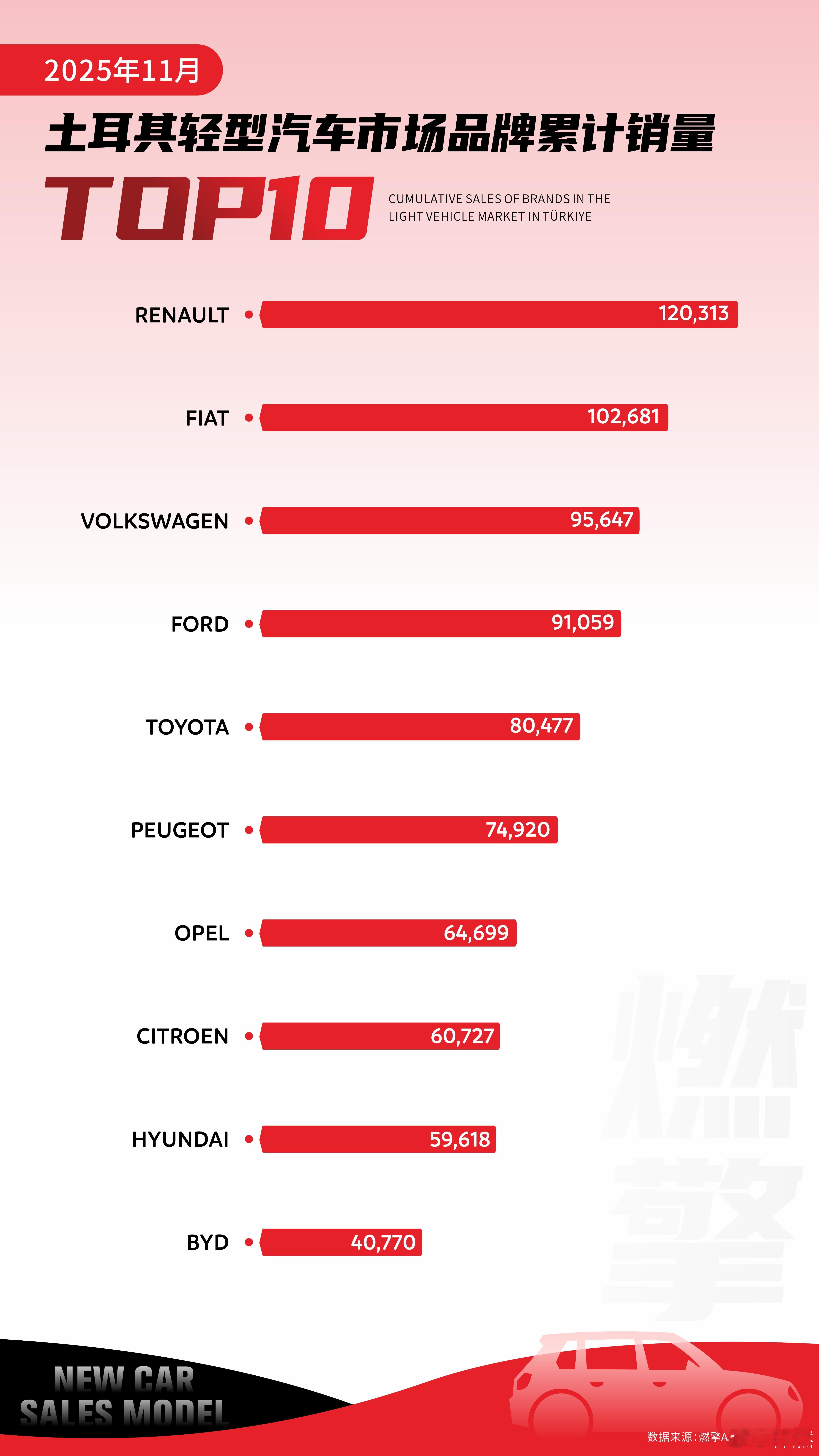 整体来看,土耳其市场呈现出高度稳定且层次分明的品牌格局。欧系品牌凭借地理邻近性与长期深耕占据主导;丰田作为经典选择保持稳定;而比亚迪的入围,则为这场竞争增添了新的变数,预示着市场格局未来可能迎来更多的动态演变。大v聊车