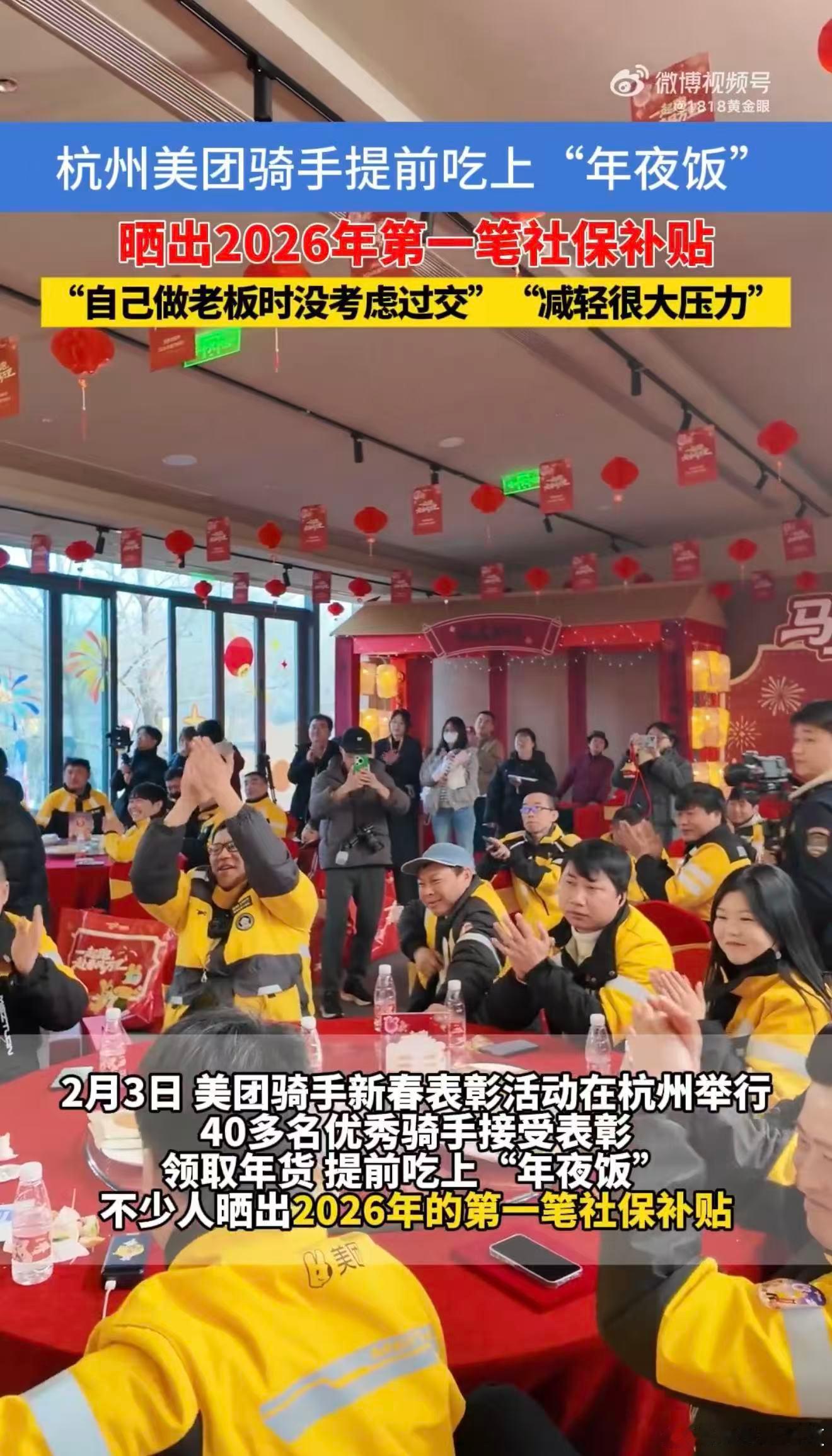 杭州骑手年夜饭现场领米面粮油年货以前总觉得骑手就是赶时间、跑单子,但看到年夜饭现场有人领奖、有人被表彰,还有人说“以前自己当老板没交社保,现在终于交上了”,突然觉得这份工作也慢慢被托住了2026新春走基层