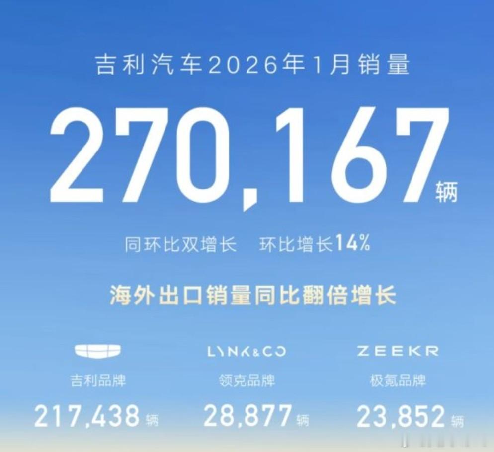 吉利控股一月乘用车销量为270167辆,同比增长1%,环比增长14%,吉利汽车销量实现同环比双增长,新能源销量12.4万辆,海外出口销量同比翻倍增长。 其中,1月新能源车销量124252辆,同比增长3%。具体来看,吉利中国星1月销量134448辆,环比增长高达86%;吉利银河品牌1月销量82990辆;领克品牌1月销量28877辆,其中新能源车型销量17410辆,新能源销量同比增长12%;极氪品牌1月销量达23852辆,销量实现同比增长99.7%大幅度增长。另外,吉利汽车1月海外出口销量60506辆,环比增长50%,同比增长121%。27.02万辆的销量背后,是吉利体系韧性、多品牌协同与全球化布局的综合体现。在行业普遍承压的1月,这份“双正增长”的成绩单显得格外亮眼。吉利汽车行政总裁兼执行董事桂生悦此前表示,2026年第一季度,吉利汽车具备多个利好因素,其中吉利汽车在燃油车领域具备竞争优势,而国内新能源汽车购置税补贴退坡利好燃油车市场。吉利银河算是传统车企里的新能源尖子生。1月份卖了82990台,虽然同比微降11.3%,但在吉利汽车内部仅次于中国星系列,并且达成了累计销量和用户破百万的成就,是行业里最快达成这一成就的新能源品牌。吉利银河的产品基本可以做到出一款爆一款,就连1月刚上市的MPV银河V900,首周订单就突破万台,26.98万-32.98万元的限时指导价,直接切入家庭MPV竞争最激烈的市场。随着“一个吉利”战略推进,吉利银河在集团里的分量只会越来越重,说不定未来真能和新能源“一哥”平分秋色。