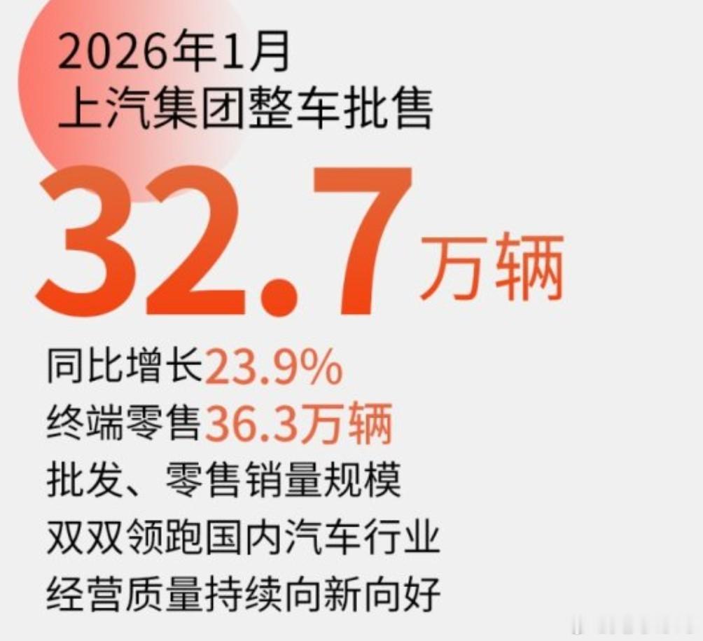 上汽集团披露今年1月的数据显示,集团实现整车批售32.7万辆稳居榜首,同比增长23.9%,终端零售36.3万辆。其中,自主品牌销量攀升、新能源汽车销量的稳定增长以及海外市场的持续发力,是上汽集团今年1月市场表现的主要看点。今年1月,上汽集团自主品牌(含上汽通用五菱)销量21.4万辆,同比增长39.6%。其中,上汽乘用车(含荣威、名爵品牌)销量为7.7万辆,同比增长53.8%;上汽大通销量为1.8万辆,同比增长18.2%;上汽通用五菱销量为10.5万辆,同比增长37%。自主品牌(含上汽通用五菱)销量占比达65.3%,较去年同期上升7.3个百分点,已取代合资板块成为上汽集团销量增长的主力引擎。其中,上汽通用五菱的销量占比接近自主品牌销量的一半,体现了上汽集团在大众化主流市场的渗透水平,显示出转型成效。。合资品牌方面,上汽通用1月销量为4.4万辆,同比增长29.3%;但上汽大众销量为6.8万辆,同比下降9%。此外,上汽商用车销售2.04万辆,同比增长21%,其中国内销量1.11万辆,同比增长28%,海外销量9373辆,同比增长14%。另一方面,海外市场已成为上汽集团新的增长极。今年1月,上汽海外市场销售10.5万辆,同比增长51.7%。其中MG今年1月在欧洲交付近2.6万辆,同比增长约15%。目前,上汽的海外布局已形成1个30万辆级(欧洲)和5个“5万辆”级(美洲、中东、澳新、东盟、南亚)年销量的海外区域市场,产品和服务已进入全球170多个国家和地区,海外累计销量突破600万辆。其中在欧洲市场,MG在意大利、西班牙、法国等国累计突破10万辆,在英国销量累计突破37万辆。在上汽集团的海外子公司中,上汽通用五菱印尼公司销售1477辆,同比增长40.5%;捷仕达名爵印度公司销售4844辆,同比增长8.7%;上汽正大(泰国公司)销售1356辆,同比下降24.9%。