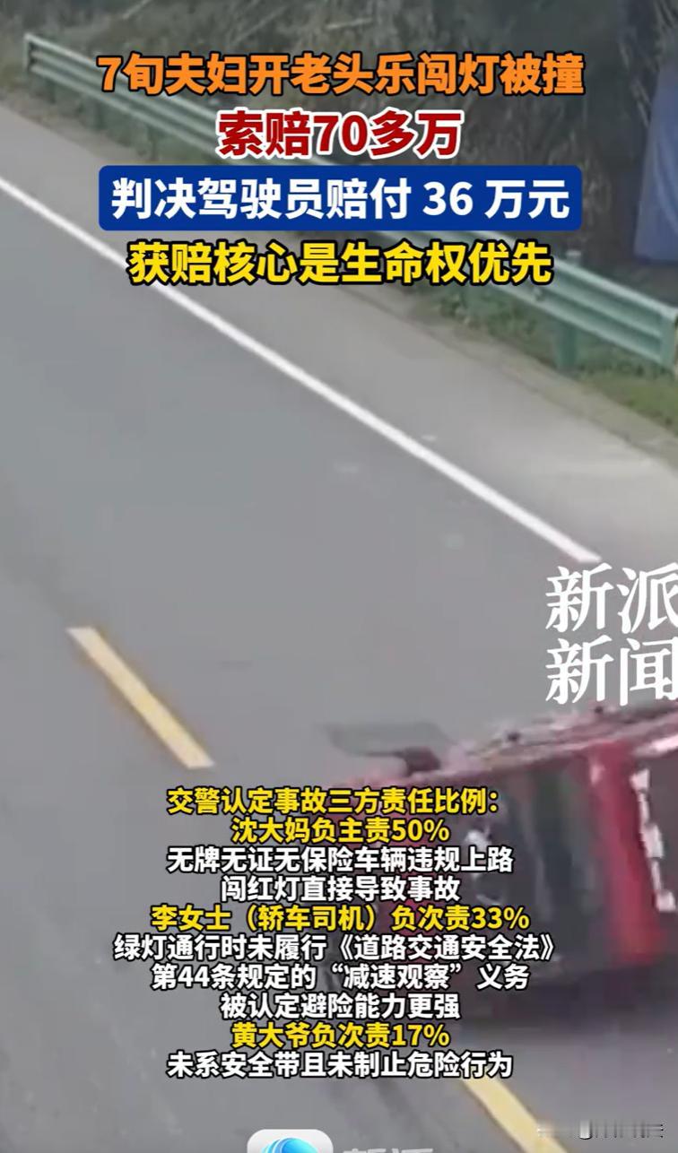 “谁弱谁有理?”上海,一大妈开着一辆老头乐,载着老伴赶回家。眼看前方红灯亮起,不料,大妈没有停下的意思,左右张望一下,一拧把手冲了出去。此时,绿灯亮起的车道,一女子正驾驶小轿车冲过来。大妈急踩刹车,躲闪不及,三轮车被撞翻在地。大妈和老伴重伤倒地,多处骨折。交警调查认定,大妈无驾照、车辆无牌无保险、闯红灯,负主责,而女子过路口未充分观察减速,负次责。事后,老两口将女子及其所属公司、保险公司告上法庭,索赔70余万。结果,法院判决女子向老两口赔付36万元,引发热议。 据悉,沈大妈70多岁,退休多年,腿脚不太利索,为了出门方便,儿女给她买了一辆“老头乐”,这种车不用上牌、不用考驾照,在她看来是再合适不过的代步工具。 有一天,沈大妈载着老伴黄大爷去菜市场,回来的路上有点赶时间。 到了那个十字路口,红灯已经亮起,但沈大妈左右张望一下,觉得车辆不多,便一拧把手冲了出去。 她没有驾驶证,也没有牌照和保险,只觉得这小车灵活方便,完全没在意红绿灯规则。 与此同时,李女士正沿着主干道行驶,绿灯亮起时,她确认了前方没有行人,便以正常速度通过路口。 但就在她驶入路口中央时,右侧突然闪出那辆蓝色的老头乐。 李女士下意识猛踩刹车,但距离太近,车头还是狠狠撞上了老头乐的侧面。 “砰”的一声巨响后,老头乐侧翻在地。 沈大妈被甩出车外,黄大爷卡在车里,双双受伤严重。 李女士脸色惨白地跳下车,颤抖着拨打了120和110。 路口很快围满了人,有人指责老头乐闯红灯,也有人怪轿车开得太快。 交警赶到后,现场勘查时,测量了刹车痕迹、调取了路口监控,还询问了多位目击者。 很快,责任认定书出来了,结果让李女士大吃一惊。 认定书显示,沈大妈承担事故50%的主要责任,理由有三条:第一,她未取得机动车驾驶证驾驶车辆;第二,她驾驶的“老头乐”属于非标车辆,未经登记上牌,按规定不得上路行驶;第三,她违反交通信号灯指示闯红灯通行。这三项违法行为直接导致了事故的发生。 李女士承担33.3%的次要责任,交警的解释是,其驾驶车辆行经路口时应当减速慢行,李女士虽然以限速行驶,但未充分观察到侧方突然出现的车辆,未尽到安全驾驶的注意义务。 乘客黄大爷承担16.7%的次要责任,这是因为其作为成年人,他应当知道乘坐无证驾驶、无牌车辆的风险,却未劝阻或采取安全措施,未履行对自身安全的注意义务。 事故后,沈大妈和黄大爷因身体多处骨折,不得不住院治疗,产生了大量医疗费、护理费等损失。 沈大妈和黄大爷认为李女士有不可推卸的责任,遂一纸诉状将李女士和她的车辆保险公司等告上法庭,索赔总计70余万元。 法院会如何判决呢? 《道路交通安全法》第四十四条规定。机动车通过交叉路口,……通过没有交通信号灯、交通标志、交通标线或者交通警察指挥的交叉路口时,应当减速慢行,并让行人和优先通行的车辆先行。 法院指出,李女士的绿灯通行权系合法权利,但权利的行使不得损害他人合法权益。 虽本案路口设有信号灯,但基于道路交通的复杂性和突发性,机动车在通过任何路口时负有审慎观察、防御性驾驶的义务。 李女士未能更早发现侧方异常情况,存在观察上的迟延。 交警认定李女士承担33.3%的次要责任,是基于其未减速等过错程度对事故原因力的贡献。 又《民法典》第一千一百六十五条规定,行为人因过错侵害他人民事权益造成损害的,应当承担侵权责任。 法院进一步指出,李女士的驾驶行为在注意义务方面存在瑕疵,且该瑕疵与沈大妈和黄大爷的损害后果存在事实上的因果关系,理应承担相应责任。 不过,《民法典》第一千一百七十三条规定,被侵权人对同一损害的发生或者扩大有过错的,可以减轻侵权人的责任。 法院认为,沈大妈因同时存在无证驾驶、闯红灯等严重违法,过错程度明显更大,交警认定其承担50%责任,并无不妥,而黄大爷作为乘客,明知乘坐车辆有瑕疵,亦有过错,交警认定承担16.7%责任,相对合理。 基于此,法院认定李女士仅就其过错对应的损失部分即33.3%承担赔偿责任。 此外,《民法典》第一千二百一十三条规定,机动车发生交通事故造成损害,属于该机动车一方责任的,先由承保机动车强制保险的保险人在强制保险责任限额范围内予以赔偿;不足部分,由承保机动车商业保险的保险人按照保险合同的约定予以赔偿;…… 具体到本案,李女士的车辆投保了交强险、商业三者险,而经核算,沈大妈及黄大爷的损失大约为105万,李女士承担责任在35万元,未超出保险责任限额。 另外,沈大妈及黄大爷还主张了律师费。 最终,法院判决李女士赔偿沈大妈级黄大爷36万元,由保险公司赔付35万元,李女士所属公司赔偿6000元律师费。 对此,您怎么看?