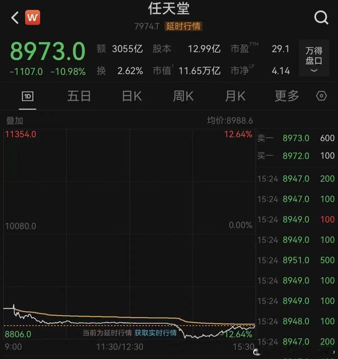 【任天堂市值一天蒸发640亿】2月4日,在日本股票市场上,知名电子游戏公司任天堂的股价放量暴跌,盘中跌幅一度超过12%,创18个月来最大单日跌幅,截至收盘,股价仍大跌近11%,单日市值蒸发1.44万亿日元,折合人民币约640亿元。