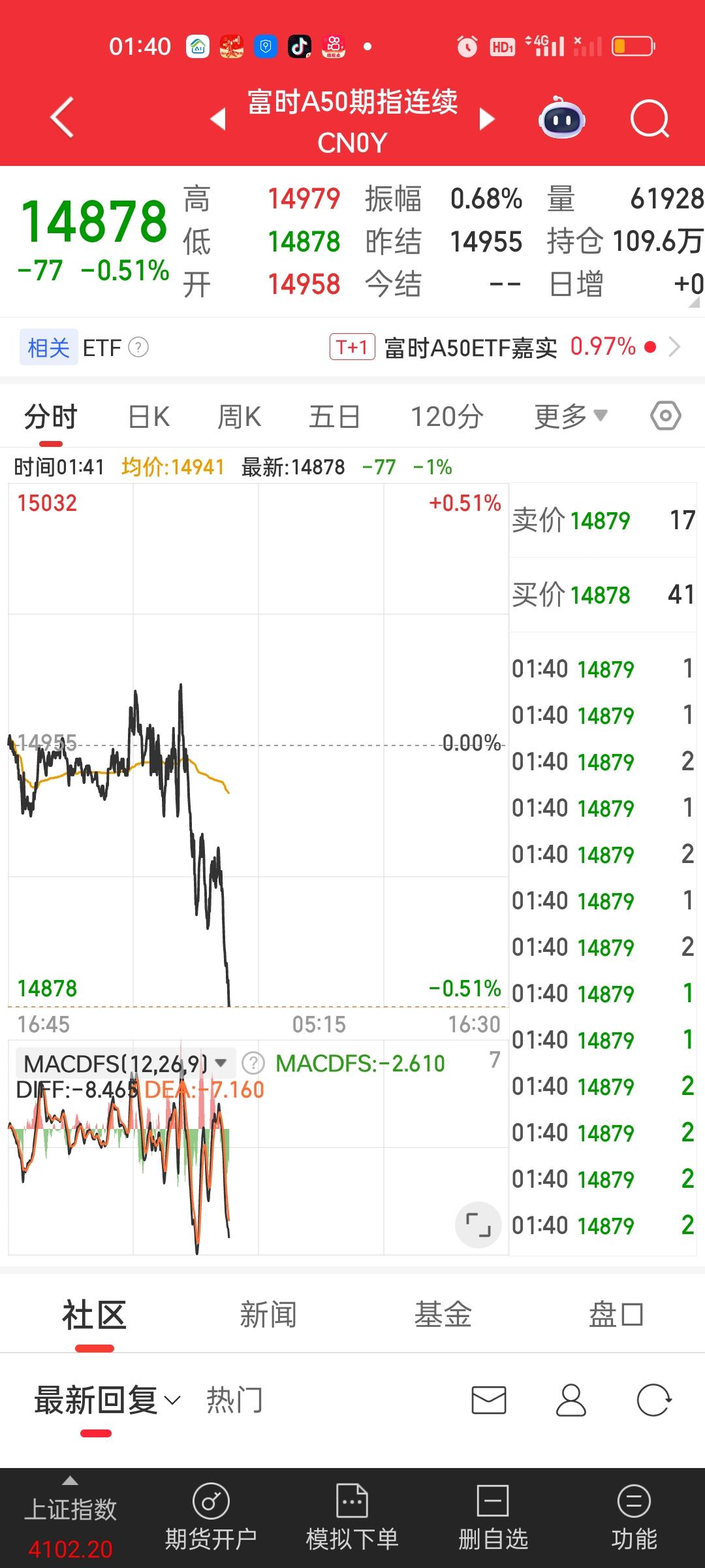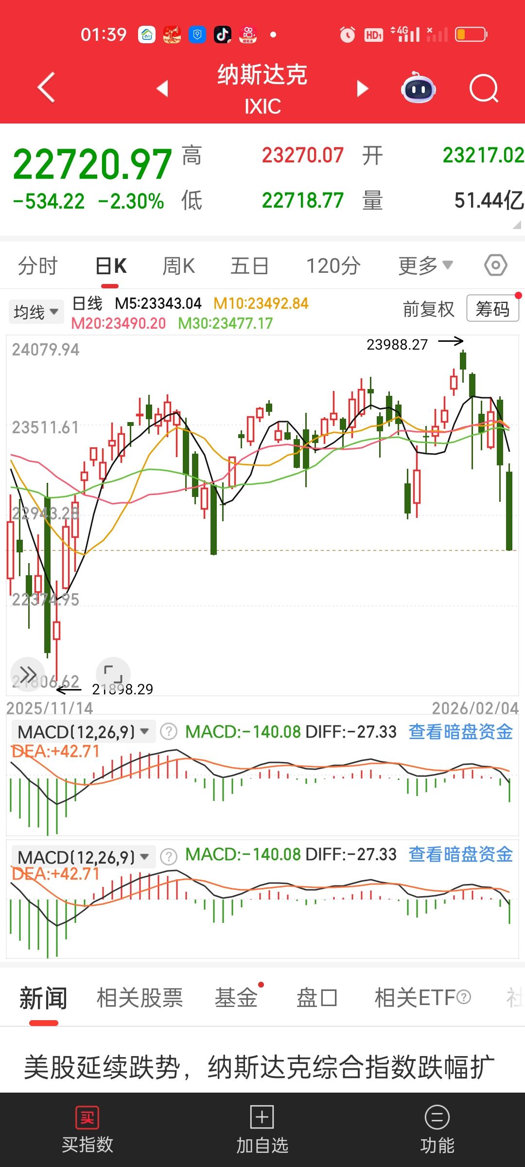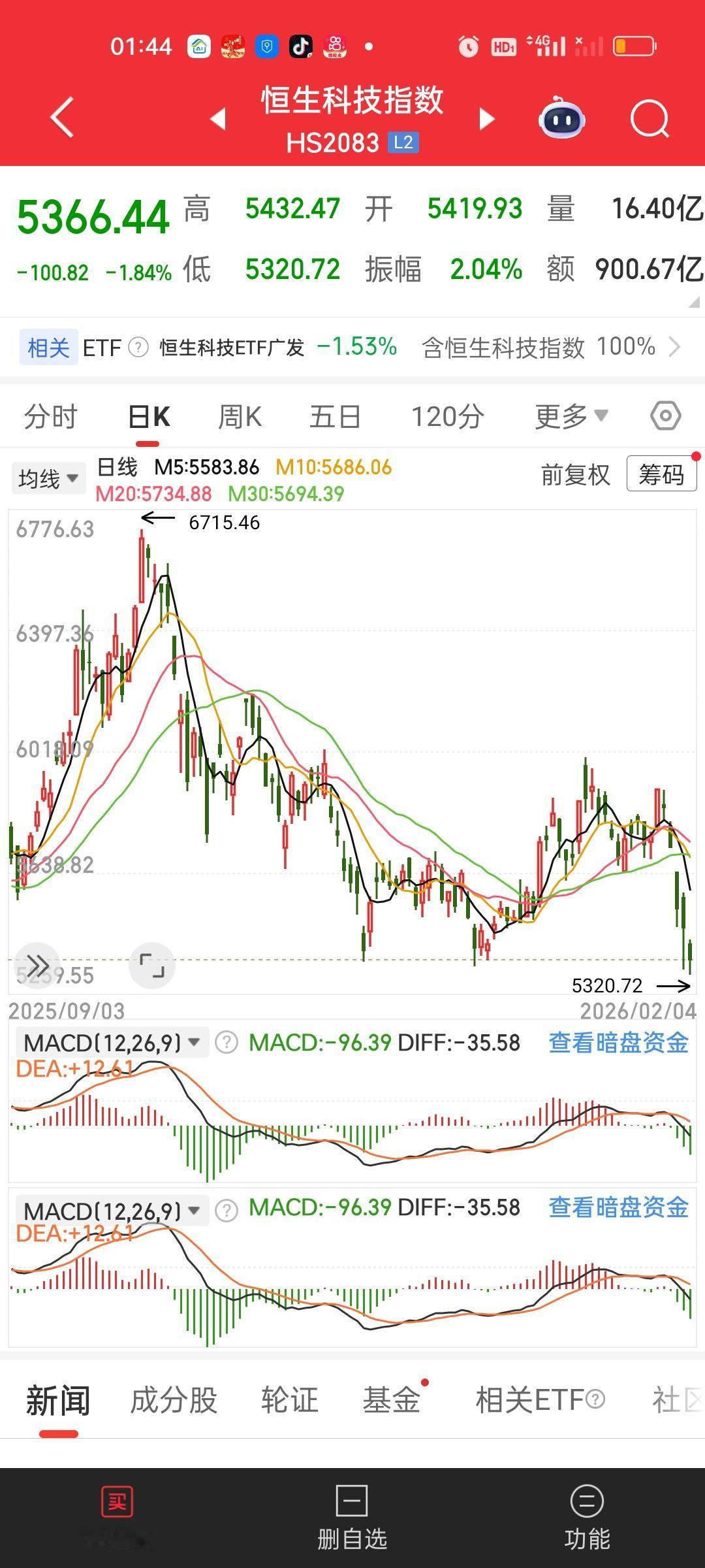 外围数据目前是走的很差的,特别是恒科期货跌幅是很大的,恒科连续杀了5个交易日,指数已经创出短期内的新低,假如明天再跌2%,没有仓位的可以提前埋伏一些了,就相当于定期存款。5320/6715=0.7922,目前从高点下来已经跌了20.78%。