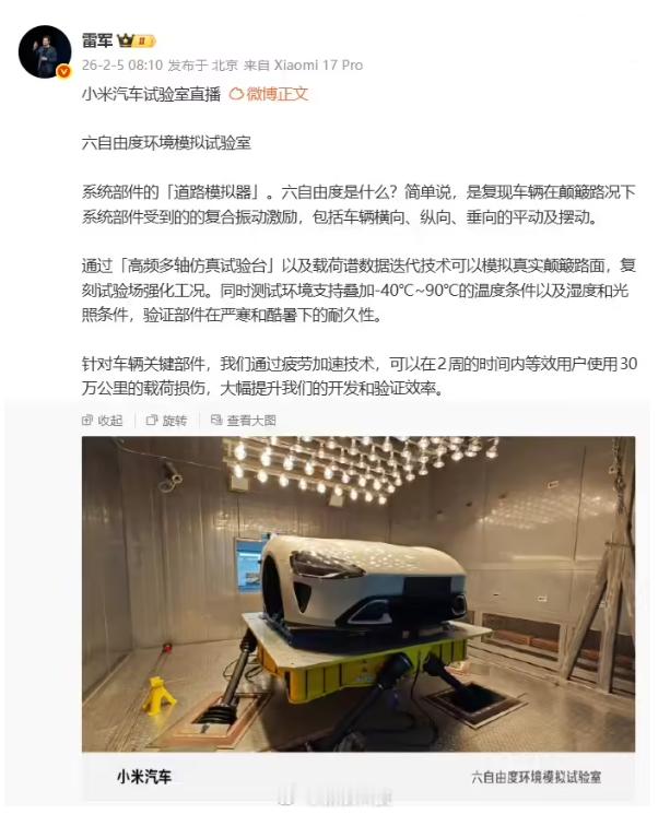 【雷军详解小米环境模拟试验室:可复刻试验场强化工况,验证部件在严寒和酷暑下耐久性】小米创办人、董事长兼 CEO 雷军今日继续介绍了小米汽车的实验室 —— 六自由度环境模拟试验室。其中,六自由度指复现车辆在颠簸路况下系统部件受到的复合振动激励。