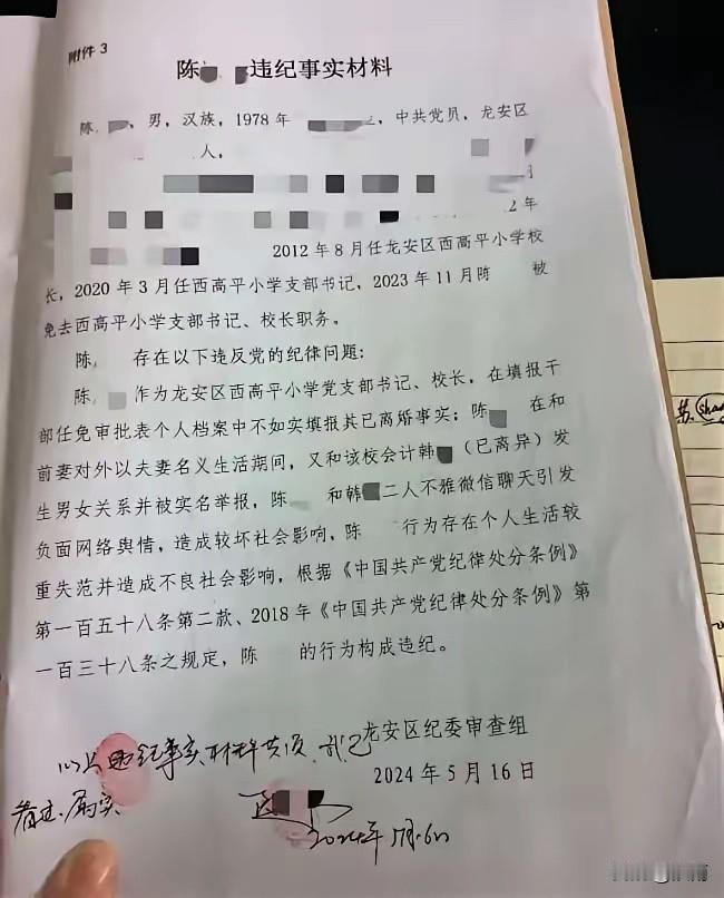 河南安阳一小学校长和女教师谈恋爱被教育局认定师德不佳,到底冤不冤? 48岁的陈校长是2011年和妻子离的婚,离婚后二人并没有对外公布。 而34岁的韩会计是在2022年离的婚。2023年二人确认恋爱关系。 陈校长一方面和前妻以夫妻名义对外行事,背后暗里却和同校离异女会计谈恋爱行夫妻之实。 这可能就让韩会计的前夫误会了。在发现前妻手机里和陈校长的不雅聊天记录后,他向教育部门举报了此事。 审查组翻看陈校长之前的档案资料时,发现他并没有如实的填写已经离婚的事实。 因此,引发了不良的社会影响,所以受到了处分。 陈校长后被免职,调离岗位到其它学校任职,两个月后在职称晋升评定中,被认为失德不合格,从而影响了前途。 这让陈校长大呼冤枉,从而选择曝光此事,想讨回公道。