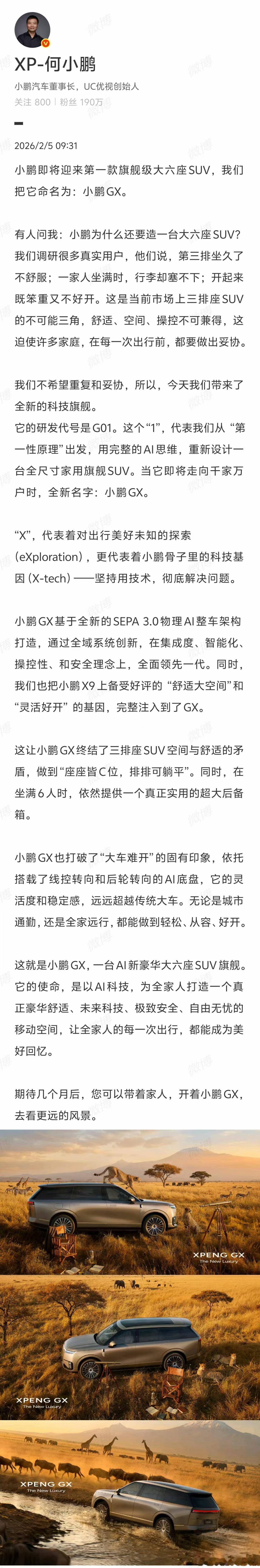 小鹏大六座SUV (代号 G01)终于来了,定名 GX