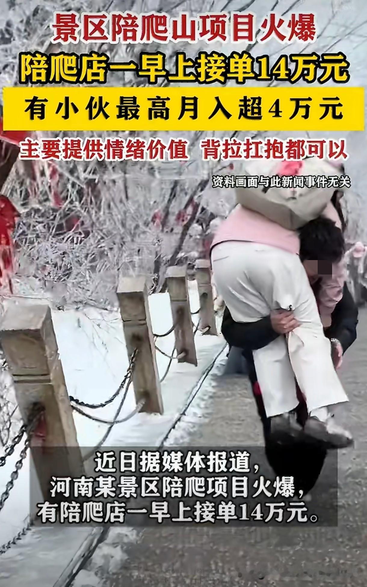 河南景区陪爬店光早上就接单14万?有小伙子一个月能挣四五万!我对着电脑敲键盘敲得手腕疼,人家陪人爬山聊天捶腿,收入直接碾压我们这些坐办公室的。 有人说这不就是出卖体力加情商嘛!背拉扛抱还陪聊,跟咱上班伺候甲方、给老板提供情绪价值有啥区别?人家明码标价,一节爬山课四百八百,咱们加班费算不清楚还不敢吭声。肯吃苦的年轻人靠这个翻身,总比躺平强,市场有需要就有人干,没毛病! 但转头一想,爬山不就是为了自己一步步登顶那个爽劲儿吗?现在倒好,花钱让人连扛带抱,气都不带喘就上去了,这成就感是算客户的还是算陪爬员的?更别说安全这事儿了——万一背人摔了、扶人扭了,这责任咋算?现在啥规范都没有,全凭胆子大。 我们打工挤地铁,不小心碰人一下都得心惊胆战怕被骂。换成花钱服务,搂抱搀扶反而成了合理项目。害,这世界有时候真是“钞能力”改写规则。 一边是年轻人找新路子拼命赚钱,一边是游客图省事买享受。你说这是消费升级还是偷懒新招?反正我看了眼自己这个月的工资条,突然觉得……要不周末我也去爬个山试试?指不定还能开发个副业呢!