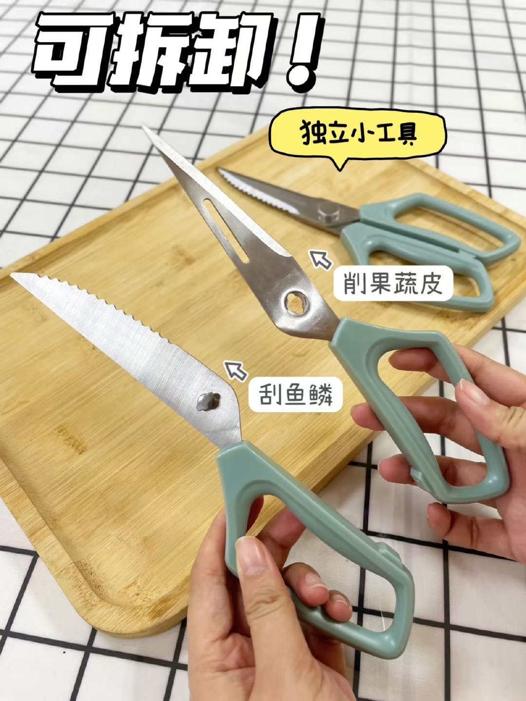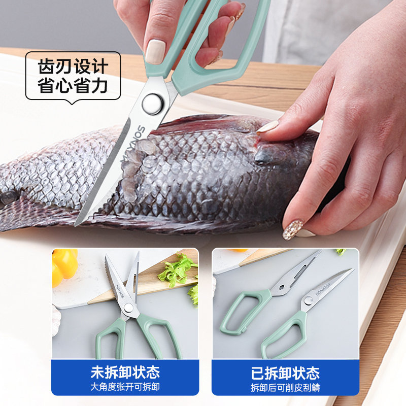 你见过可拆卸的剪刀吗?【 鲨鱼剪 】就是❗️拆开后,它秒变刮鳞刀、小菜刀、水果刀和去皮器。把剪刀分开到最大时,剪刀中间的小按钮正好对准卡槽,很容易就将剪刀拆分开了,清洗的也更干净。