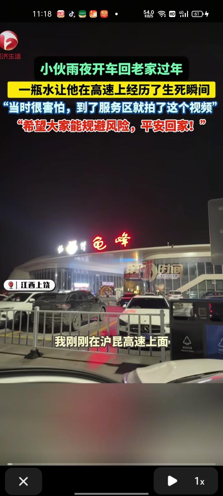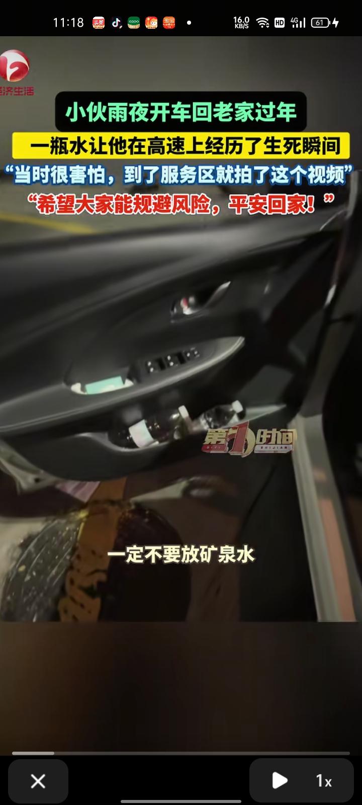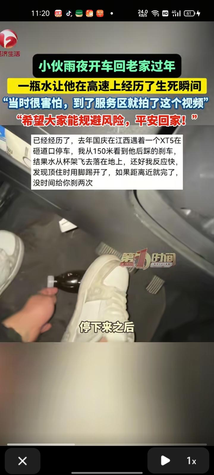 2月1日,上饶市弋阳县。小伙雨夜开车回老家过年,堵车时踩了刹车,水瓶从杯架飞落到地上。幸好反应快,发现顶住时用脚踢开了,现在已经把水瓶拿走了。 当事人彭先生表示,当时很害怕,到了服务区就拍下这个视频。希望大家规避风险,平安回家