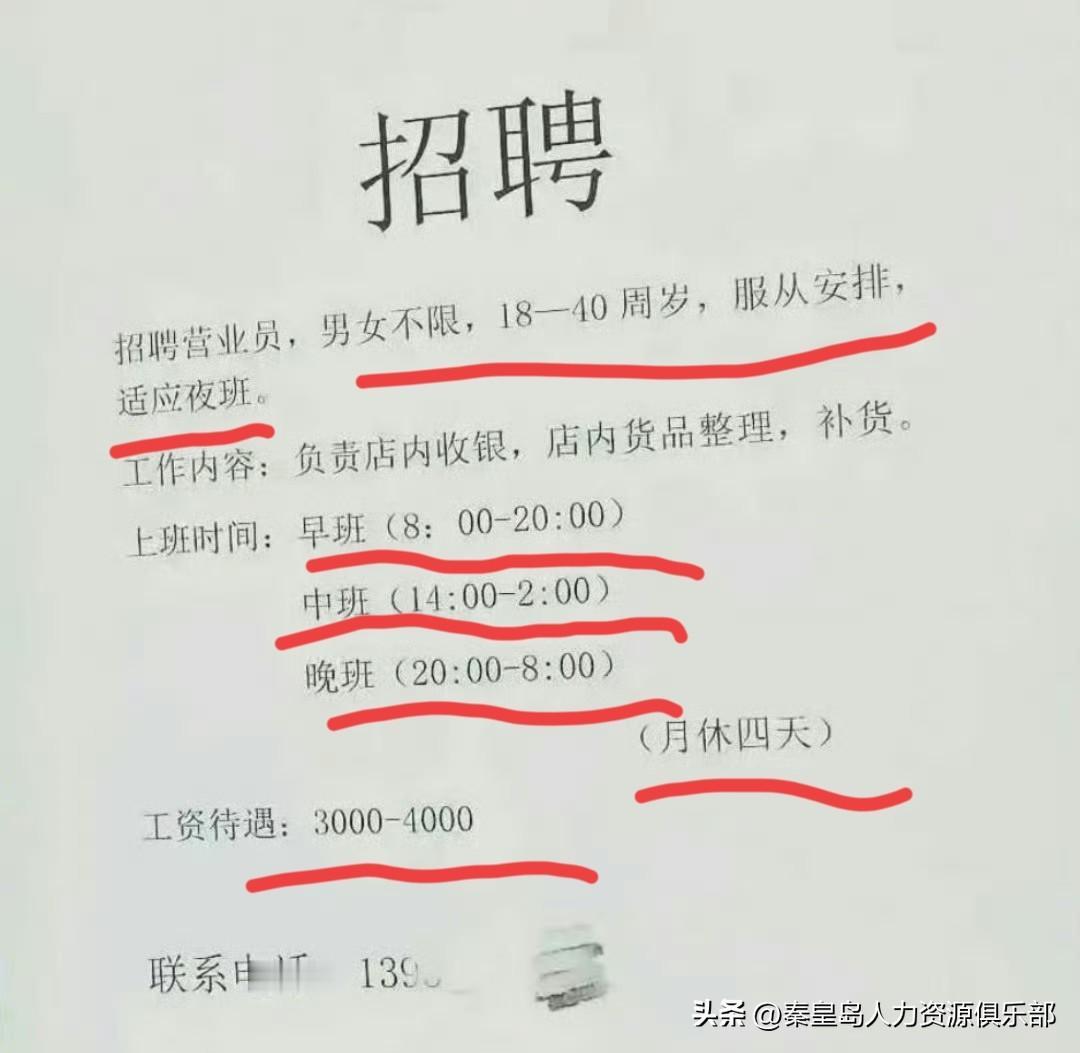 看到这个招聘我都气笑了!营业员,早班8点到晚8点,中班干到凌晨2点,晚班直接通宵到早上8点,月休四天,工资3000到4000。还得服从安排、能抗夜班。 咱掰着手指算算:这中晚班连轴转,一天干12小时,按4000顶天算,时薪都不到12块。现在外卖跑勤快点都不止这个数了吧?还要求18到40岁,这是把人的体力榨干就换下一批的意思? 有人说“月薪3000已经超过80%中国人了,总比饿死强”。是,这话难听但实在。可问题就在这儿——什么时候咱们打工人的标准,已经低到“只要饿不死就行”了?服从安排这四个字看着就怵,今天让你通宵理货,明天调你去外地看店,你都没处说理去。 这哪是招员工,这分明是找“社会牛马”。年轻人进厂打螺丝、送外卖,辛苦可收入看得见。这种班次把人熬得日夜颠倒,给这点钱,还美其名曰“提供岗位”,良心不会痛吗? 更无奈的是,这种岗位往往还真有人去——可能是急着用钱的单亲妈妈,可能是没技能的中年大哥。他们没得选,就像评论区说的:“我不干,总有更走投无路的人干。”但这不该是常态啊! 我们打工,要的是有尊严的活,不是拿健康换生存的耗材。希望老板们也明白:只谈牺牲不谈回报的岗位,永远留不住人。 毕竟谁也不是永动机,对吧?