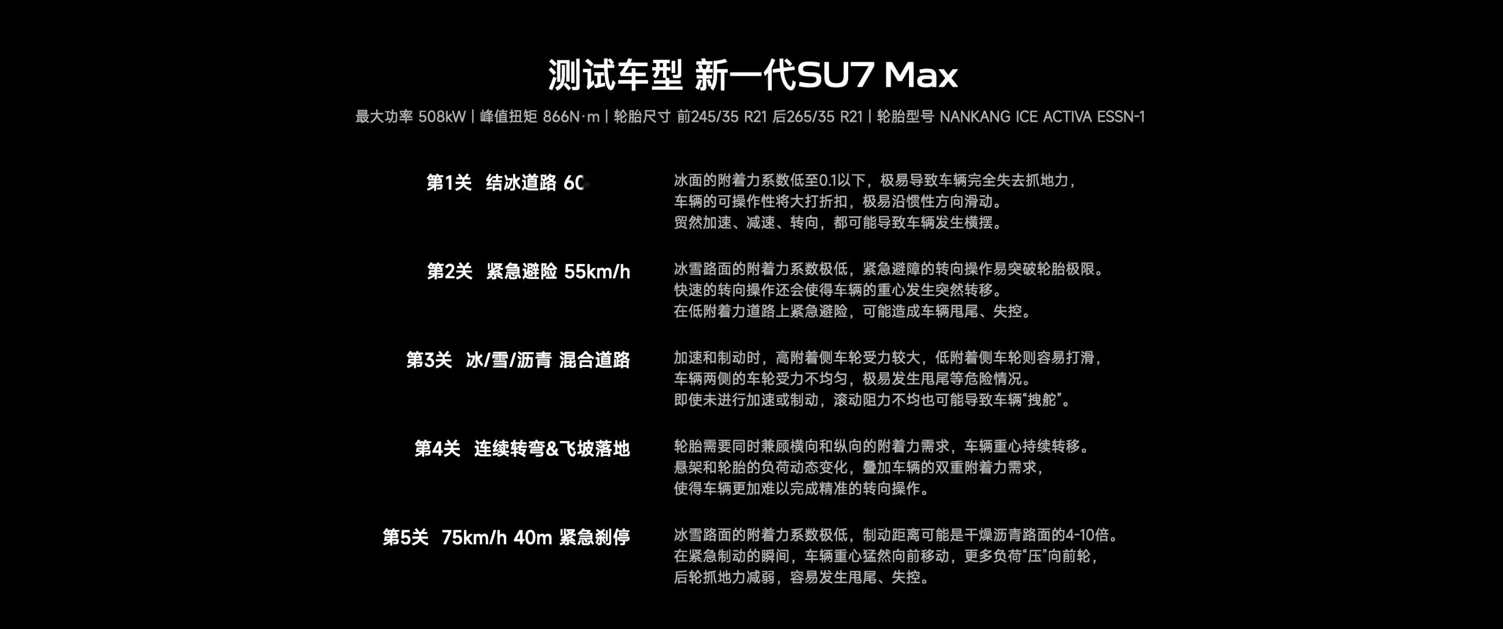 而且这次冰雪挑战的项目很贴近真实场景:地穿甲路面、紧急避障、混合附着力弯道……都是雨雪天容易遇到的状况。SU7在测试中表现非常稳健,不拽舵、不甩尾,轨迹始终精准。这就是操控实力的体现,也让我们对它的安全表现更有信心。