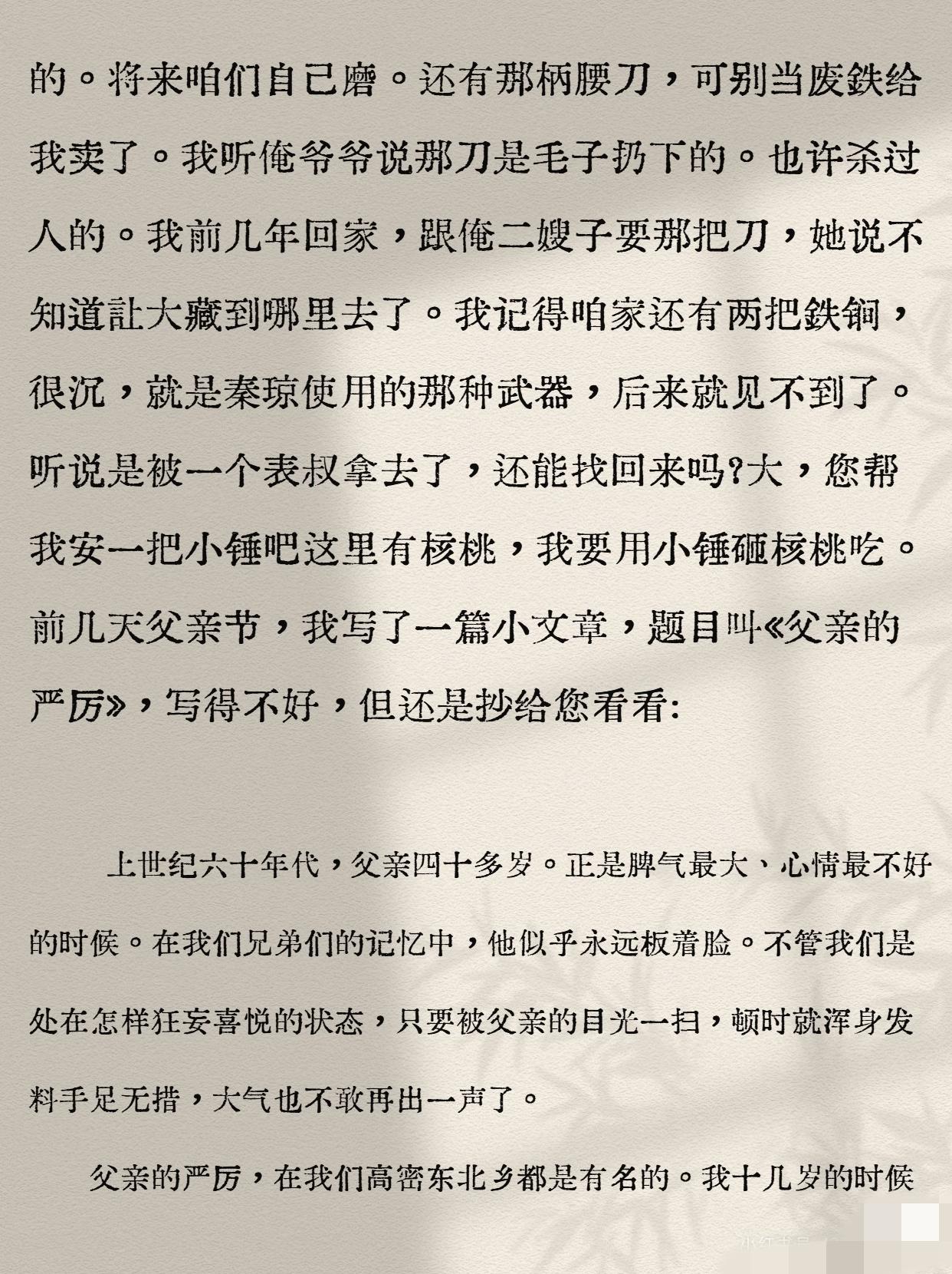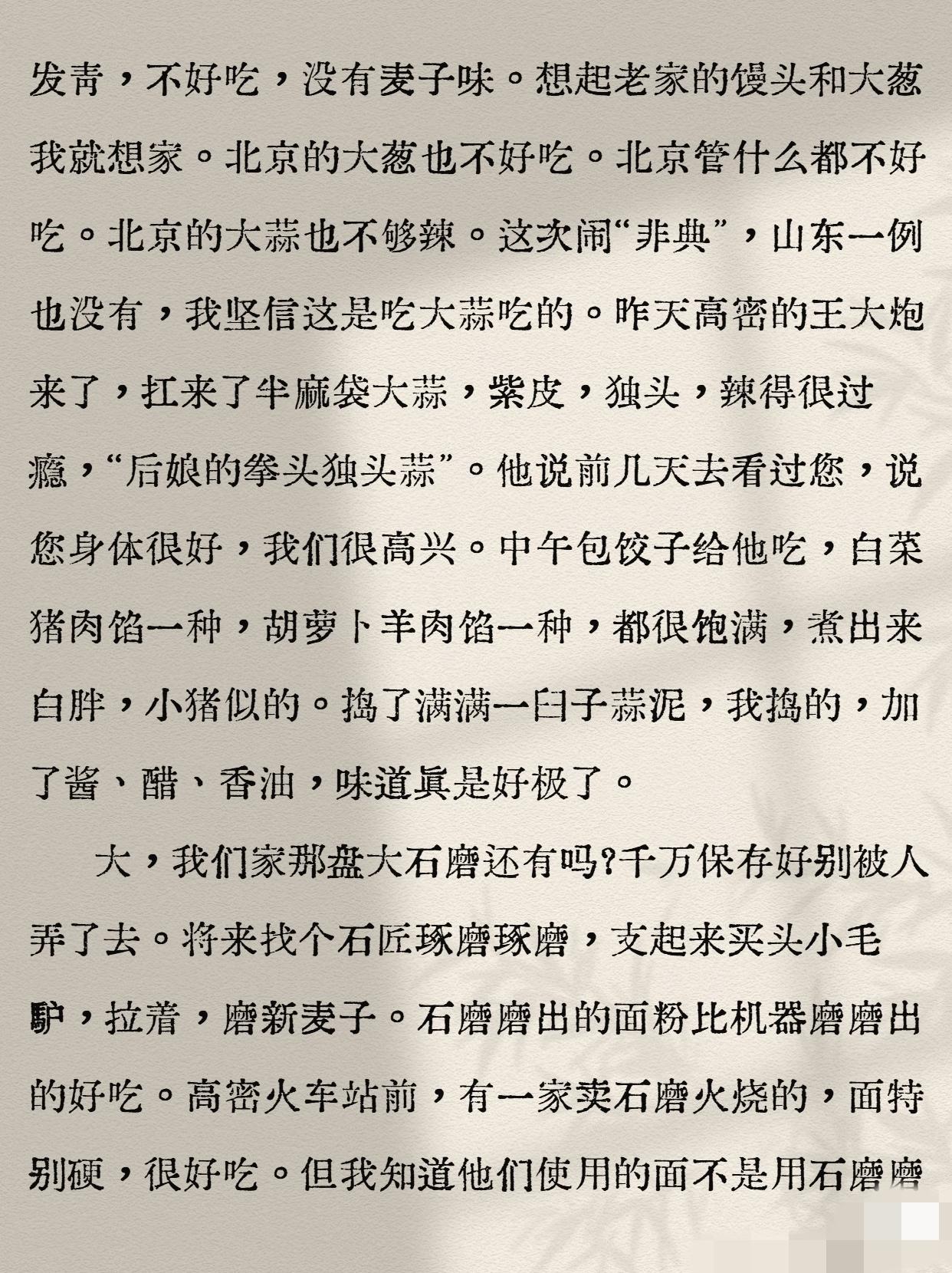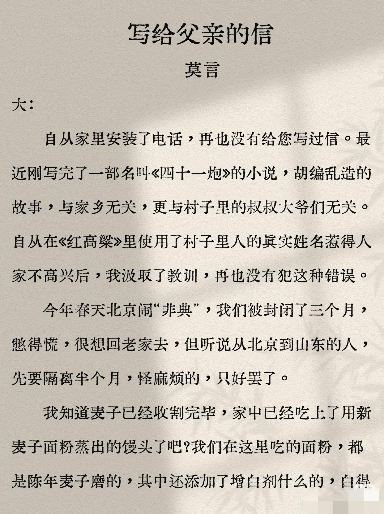 这是2003年,莫言写给父亲的一封信,字里行间,真的就像儿子和父亲唠嗑,顺便要这要那的,读起来让人感觉很真实。特别是他让父亲给他安一把小锤子,要用小锤子砸核桃吃,满满的生活气息。 信里面莫言对山东的大葱大蒜念念不忘,这个我相信,毕竟山东作为蔬菜之乡,蔬菜肯定质量好,但是石磨磨出来的面粉,真的更好吃吗?还真是没吃过石磨磨的面粉,好奇。
