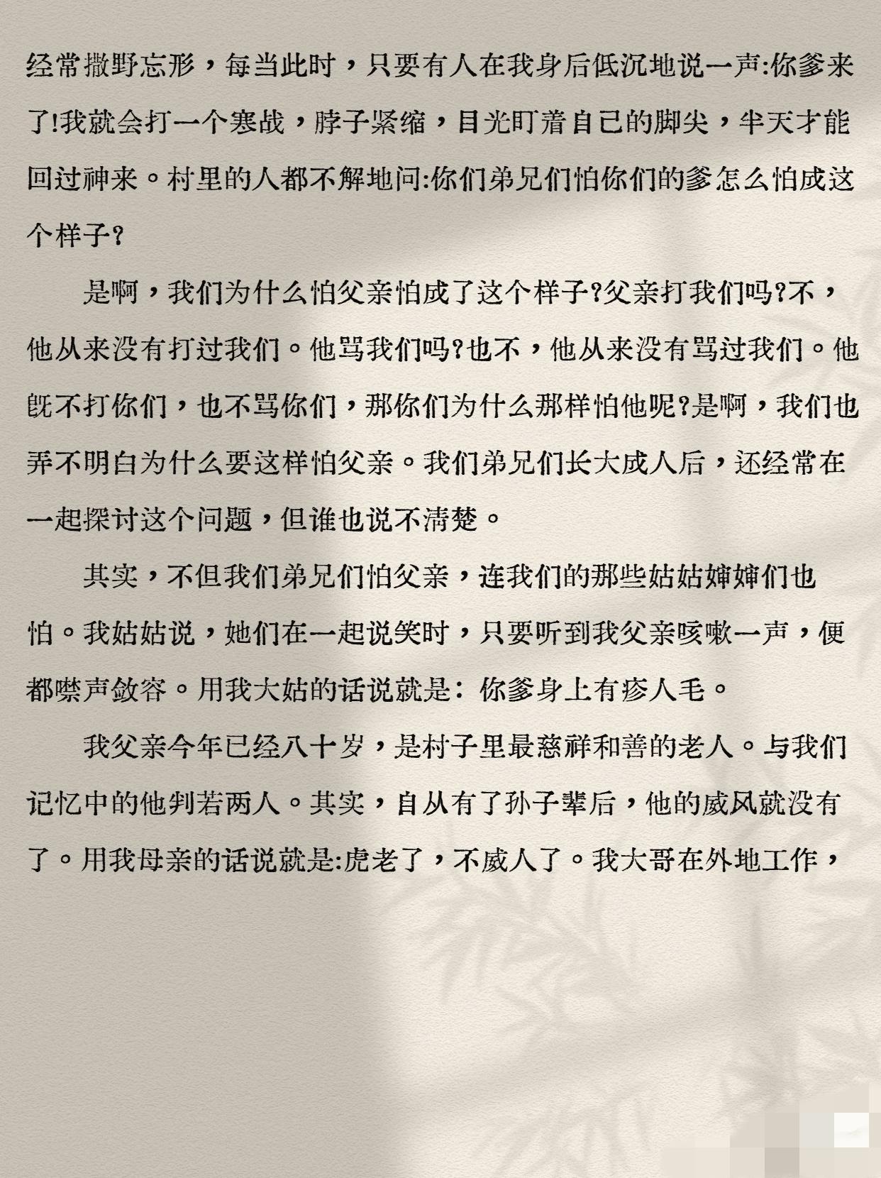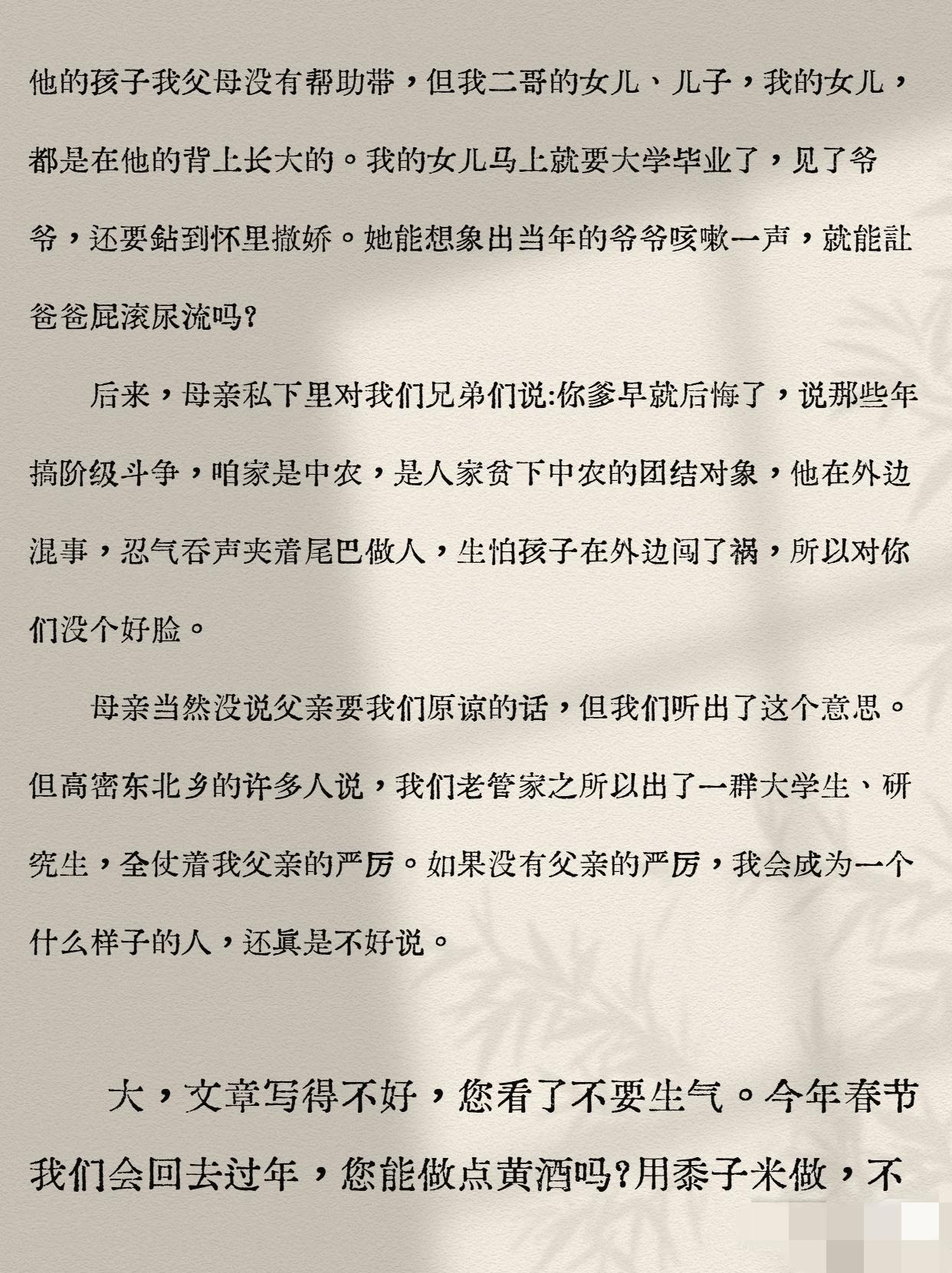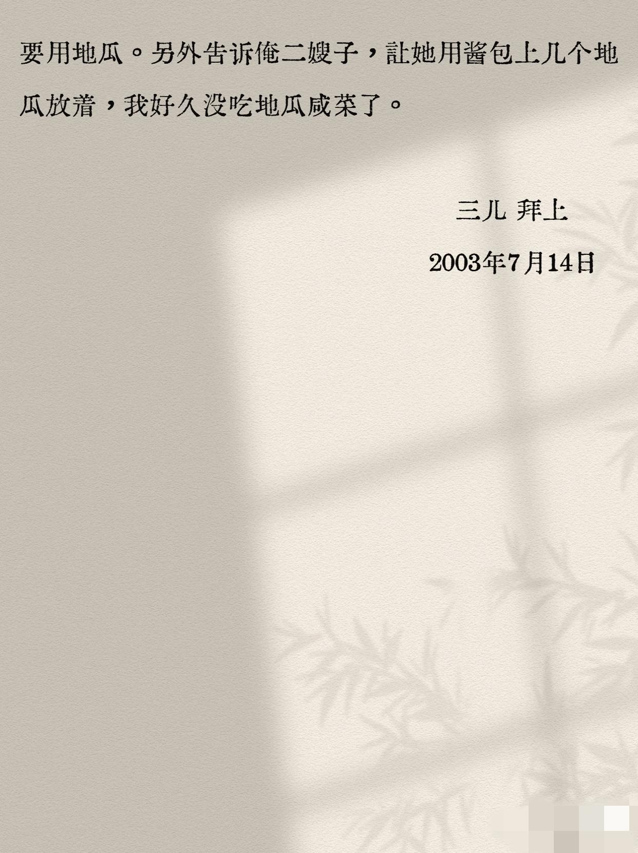 这是2003年,莫言写给父亲的一封信,字里行间,真的就像儿子和父亲唠嗑,顺便要这要那的,读起来让人感觉很真实。特别是他让父亲给他安一把小锤子,要用小锤子砸核桃吃,满满的生活气息。 信里面莫言对山东的大葱大蒜念念不忘,这个我相信,毕竟山东作为蔬菜之乡,蔬菜肯定质量好,但是石磨磨出来的面粉,真的更好吃吗?还真是没吃过石磨磨的面粉,好奇。