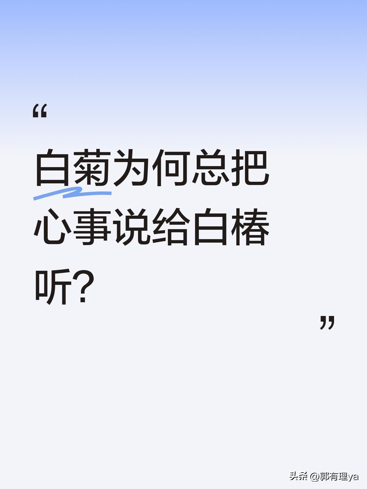 白菊为何总把心事说给白椿听? 白椿是家里和白菊最亲近的人,也是最懂她的人。白菊有什么事都愿意和白椿分享,却不知道白椿对她的感情早已超越兄妹。他只能以哥哥的身份默默守护在她身边,这份藏在心底的情感该如何安放?如果你是白椿,会选择坦白还是继续守护?