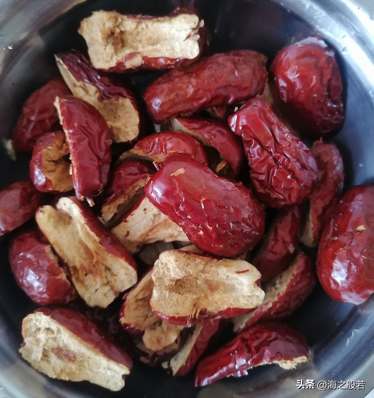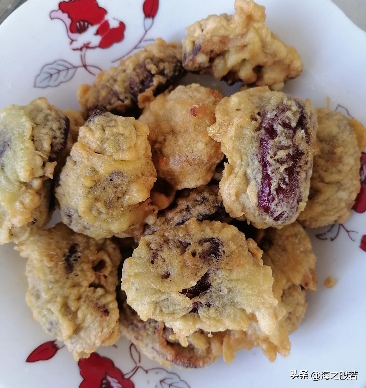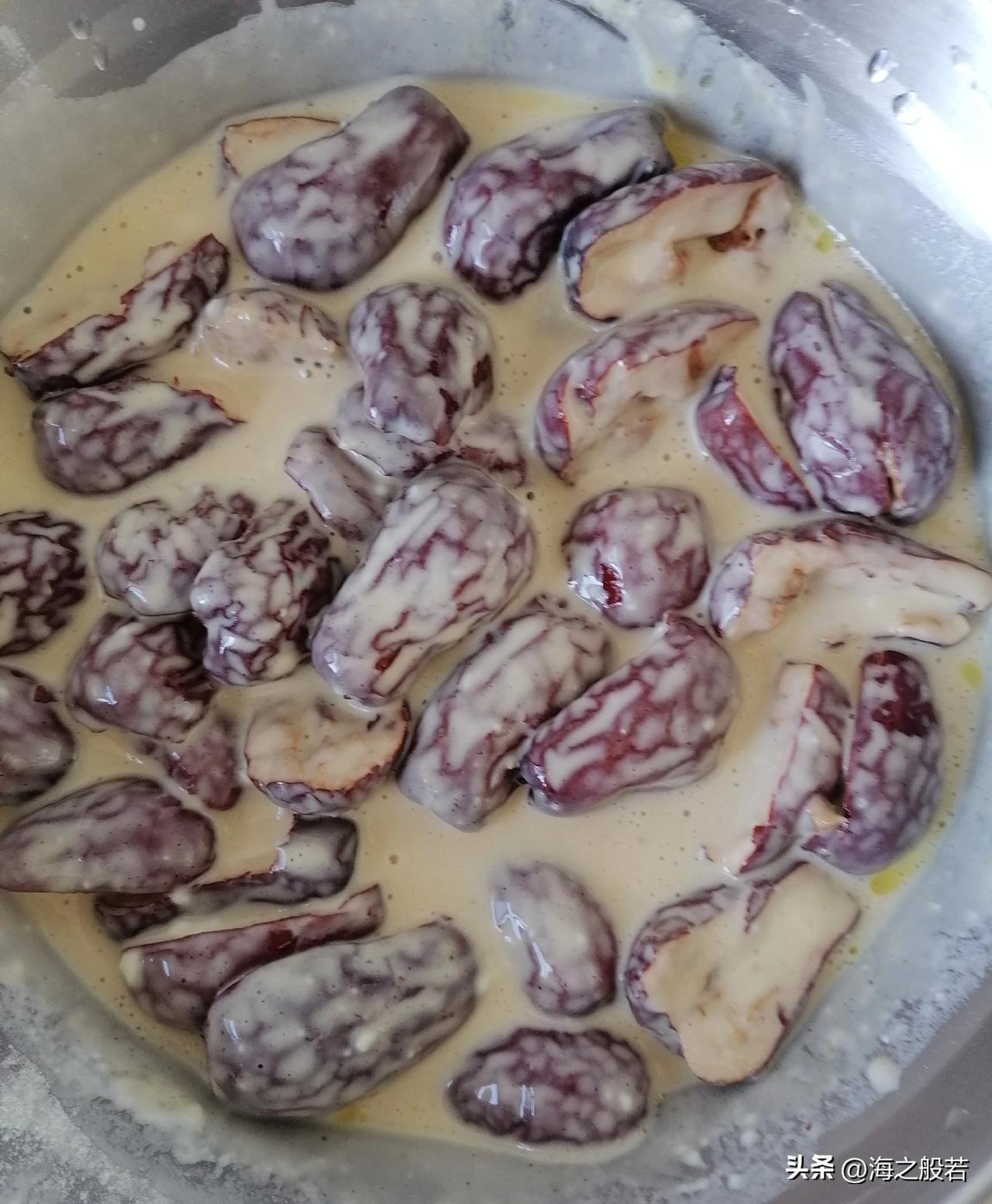 中午炸大枣。昨天炸丸子的油不能扔,继续炸年货。 开始:大枣泡水里,撒点面粉,洗得更干净。第二步,挖枣核,用剪刀剪成两半,挖出枣核。第三步,调面糊。面粉小半碗,淀粉小半碗,加水成糊状,加鸡蛋两个或三个,再加白糖一勺,五香粉少许,继续搅拌。第四步,放枣和面糊融合。然后起锅烧油,开始五成热,可以半个枣裹面糊下锅,也可以拼成一个枣,大小随意。下锅后定型再反面,颜色变深捞出。油温加大,复炸一次,两秒钟捞出,这样枣更脆。 我炸的枣比较大,半个半个炸就挺好的,吃一个又脆又甜,你一个我一个的,都说好吃,看来还得买枣去,不够吃啊!