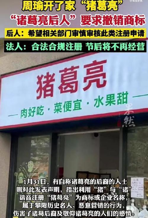 诸葛亮后裔联合发声,要求撤销“猪葛亮”商标与相关企业名称。他们认为,该谐音恶意攀附先贤、贬损形象,伤害后人与公众情感,违背公序良俗。涉事企业负责人表示将办理注销,此事引发对历史名人商业化、低俗谐音商标的热议,律师称其或违反商标法禁止性条款。成都葛亮 葛万亮