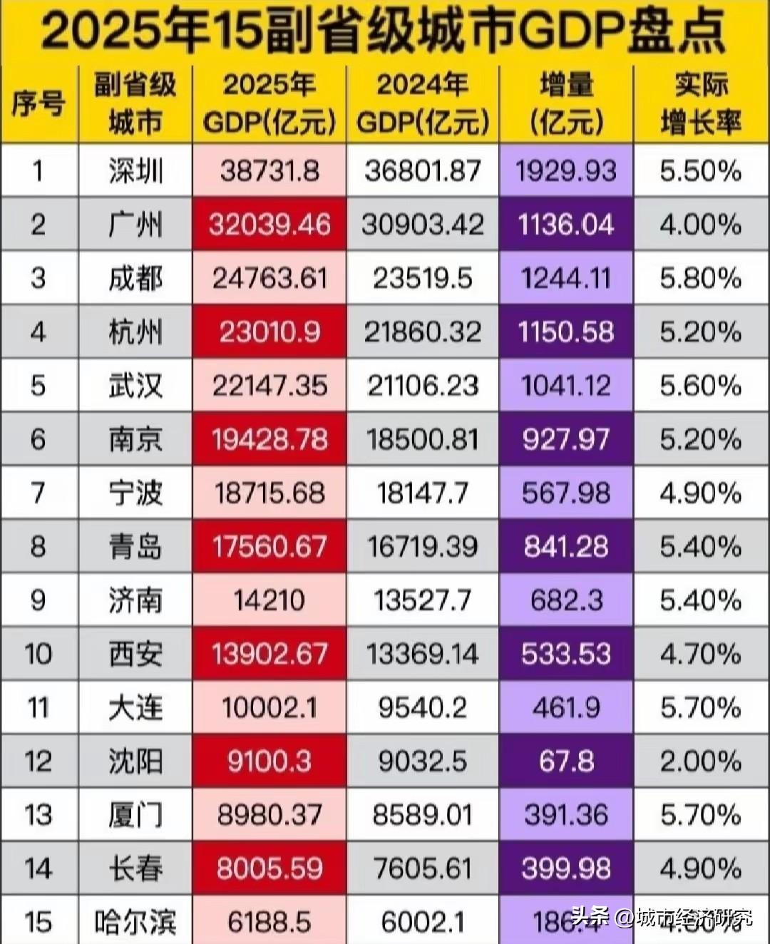 2025年十五大副省级城市GDP排名水平情况,深圳GDP以39731.8亿元人民币排名榜一,广州GDP以32039.46亿元人民币排名榜二,成都GDP以24763.61亿元人民币排名榜三,十五大副省级城市里深圳广州成都这三座城市经济实力最强大排名最高。